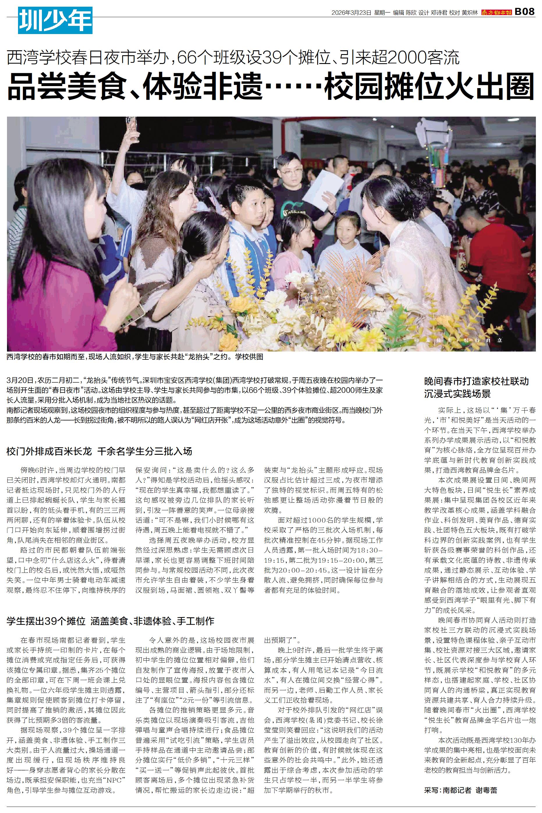 3月20日,农历二月初二,“龙抬头”传统节气。深圳市宝安区西湾学校(集团)西湾学校打破常规,于周五夜晚在校园内举办了一场别开生面的“春日夜市”活动。这场由学校主导、学生与家长共同参与的市集,以66