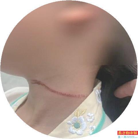 网友发布视频称7岁女儿被风筝线割伤脖子后留疤。图片来源网络