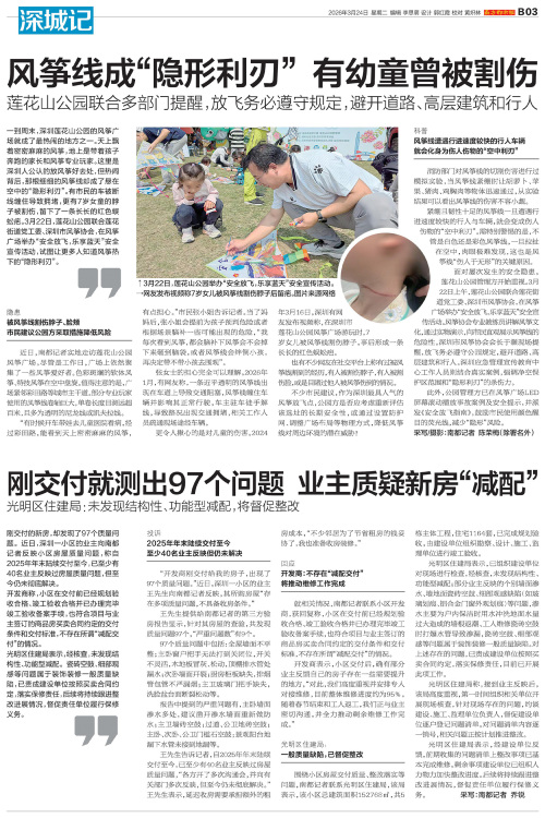 面对屡次发生的安全隐患,莲花山公园管理方开始重视。3月22日上午,莲花山公园联合莲花街道党工委、深圳市风筝协会,在风筝广场举办“安全放飞,乐享蓝天”安全宣传活动。风筝协会专业教练员讲解风筝文化,通过实物演示,向市民直观展示风筝线的危险性。深圳市风筝协会会长于灏现场提醒,放飞务必遵守公园规定,避开道路、高层建筑和行人。深圳应急管理宣传教育中心工作人员则结合真实案例,强调净空保护区范围和“隐形利刃”的杀伤力。