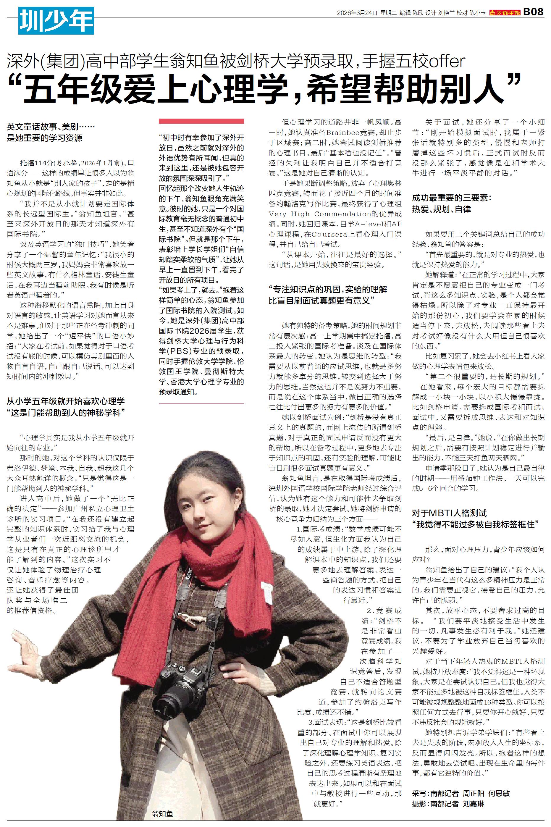“初中时有幸参加了深外开放日,虽然之前就对深外的外语优势有所耳闻,但真的来到这里,还是被她包容开放的氛围深深吸引了。” 回忆起那个改变她人生轨迹的下午,翁知鱼眼角充满笑意。彼时的她,只是一个对国