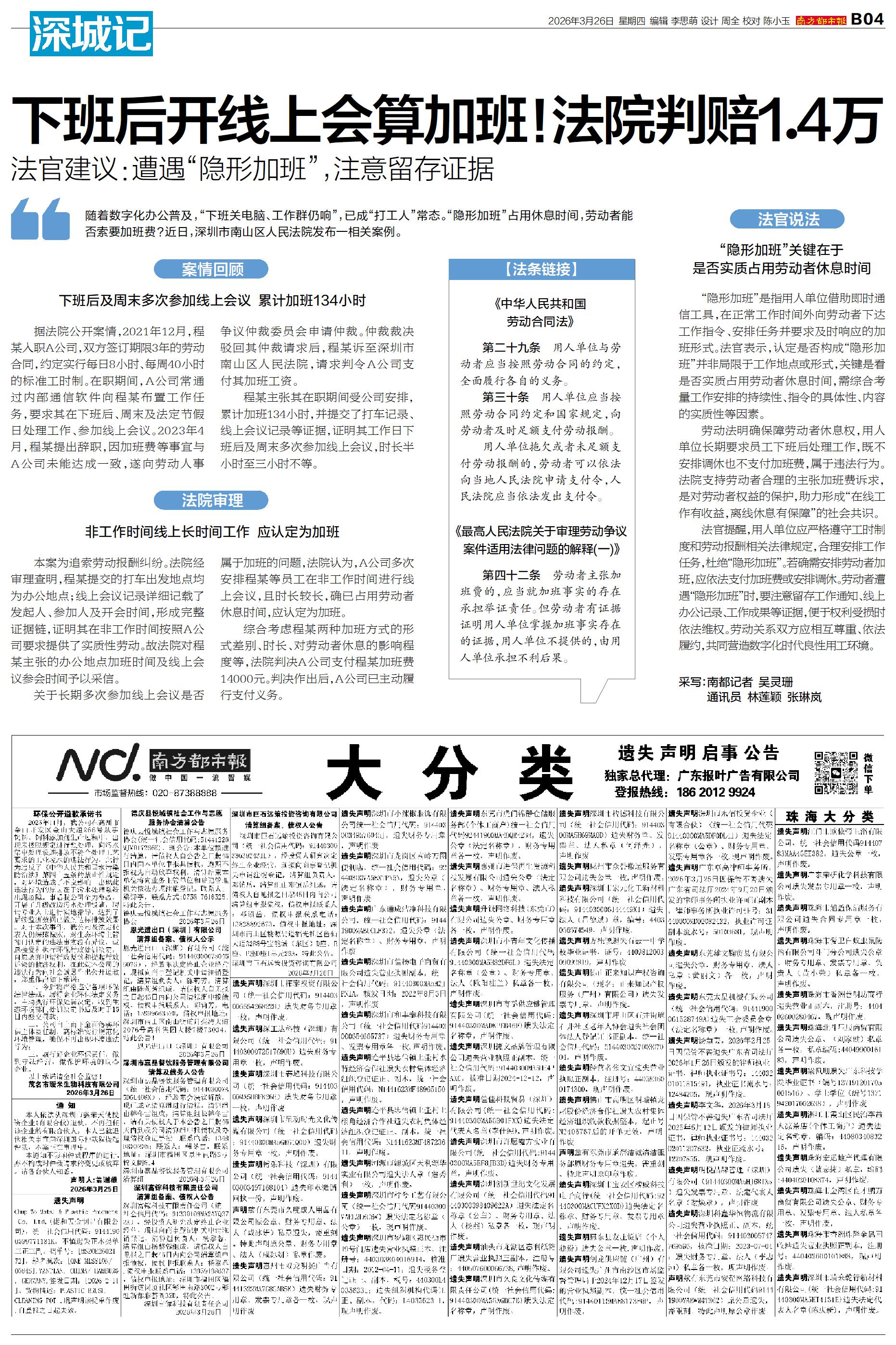 随着数字化办公普及,“下班关电脑、工作群仍响”,已成“打工人”常态。“隐形加班”占用休息时间,劳动者能否索要加班费?近日,深圳市南山区人民法院发布一相关案例。 案情回顾 下班后及周末多次参加线