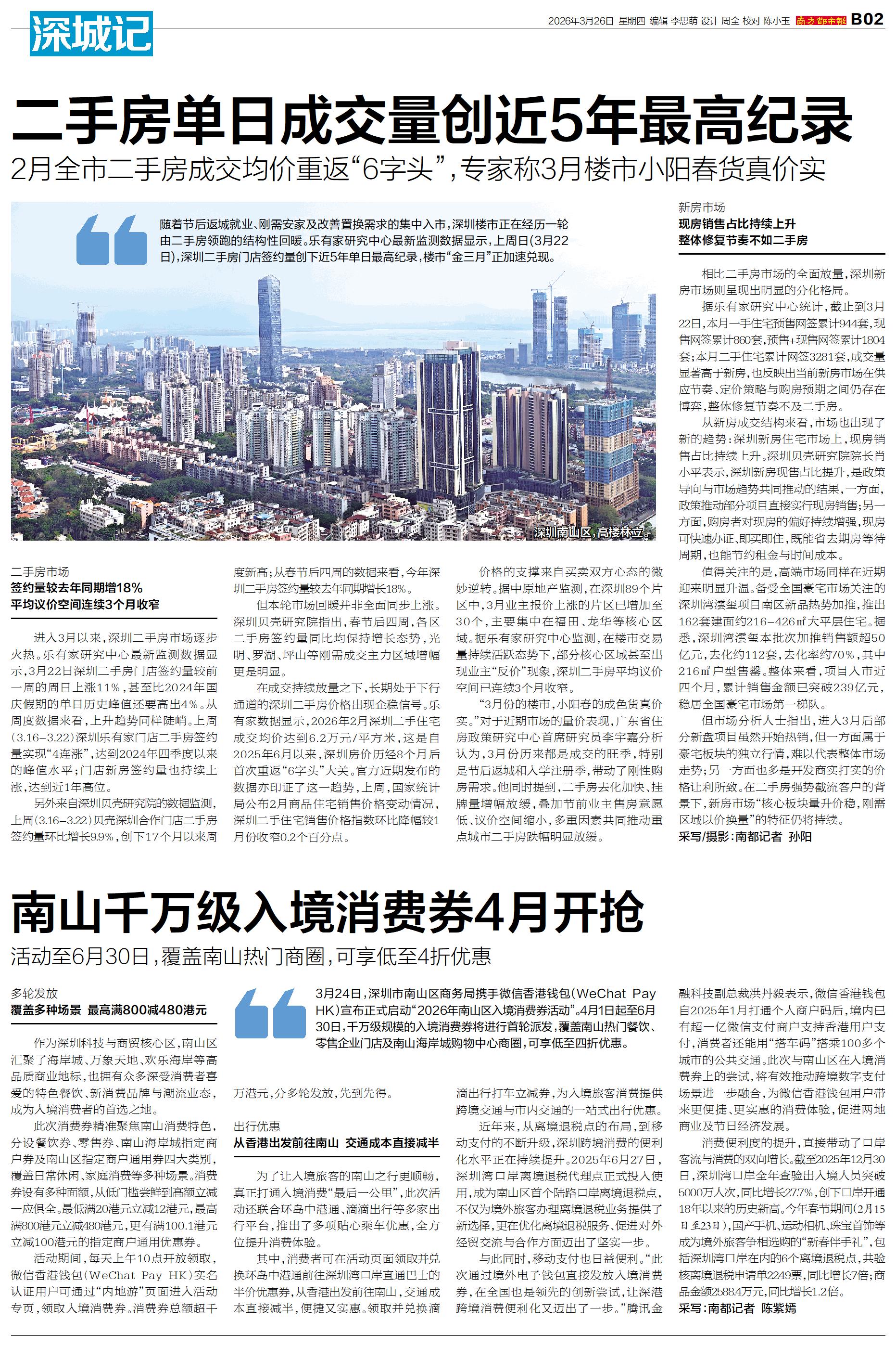 随着节后返城就业、刚需安家及改善置换需求的集中入市,深圳楼市正在经历一轮由二手房领跑的结构性回暖。乐有家研究中心最新监测数据显示,上周日(3月22日),深圳二手房门店签约量创下近5年单日最高纪录,
