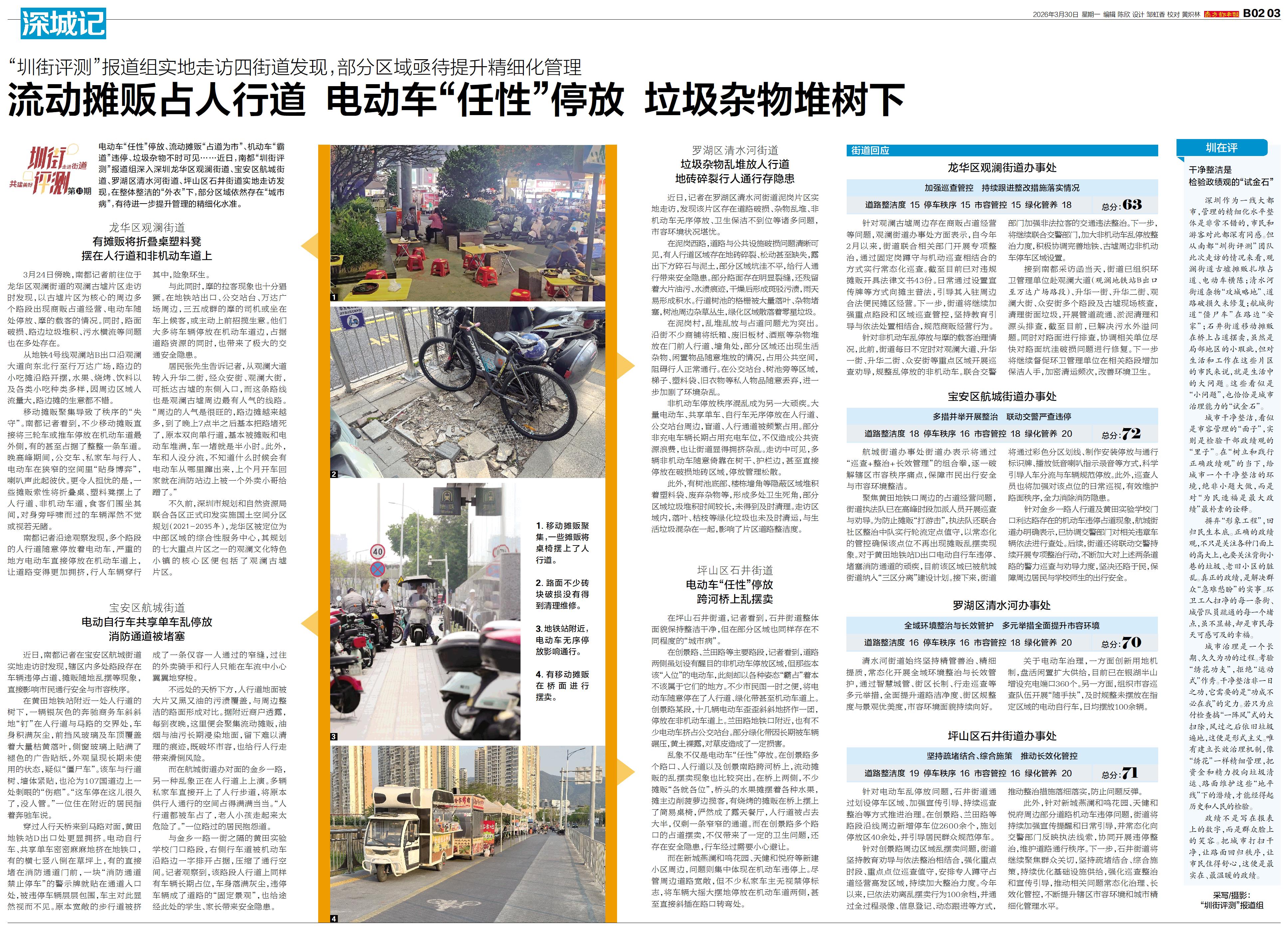 电动车“任性”停放、流动摊贩“占道为市”、机动车“霸道”违停、垃圾杂物不时可见……近日,南都“圳街评测”报道组深入深圳龙华区观澜街道、宝安区航城街道、罗湖区清水河街道、坪山区石井街道实地走访发现,