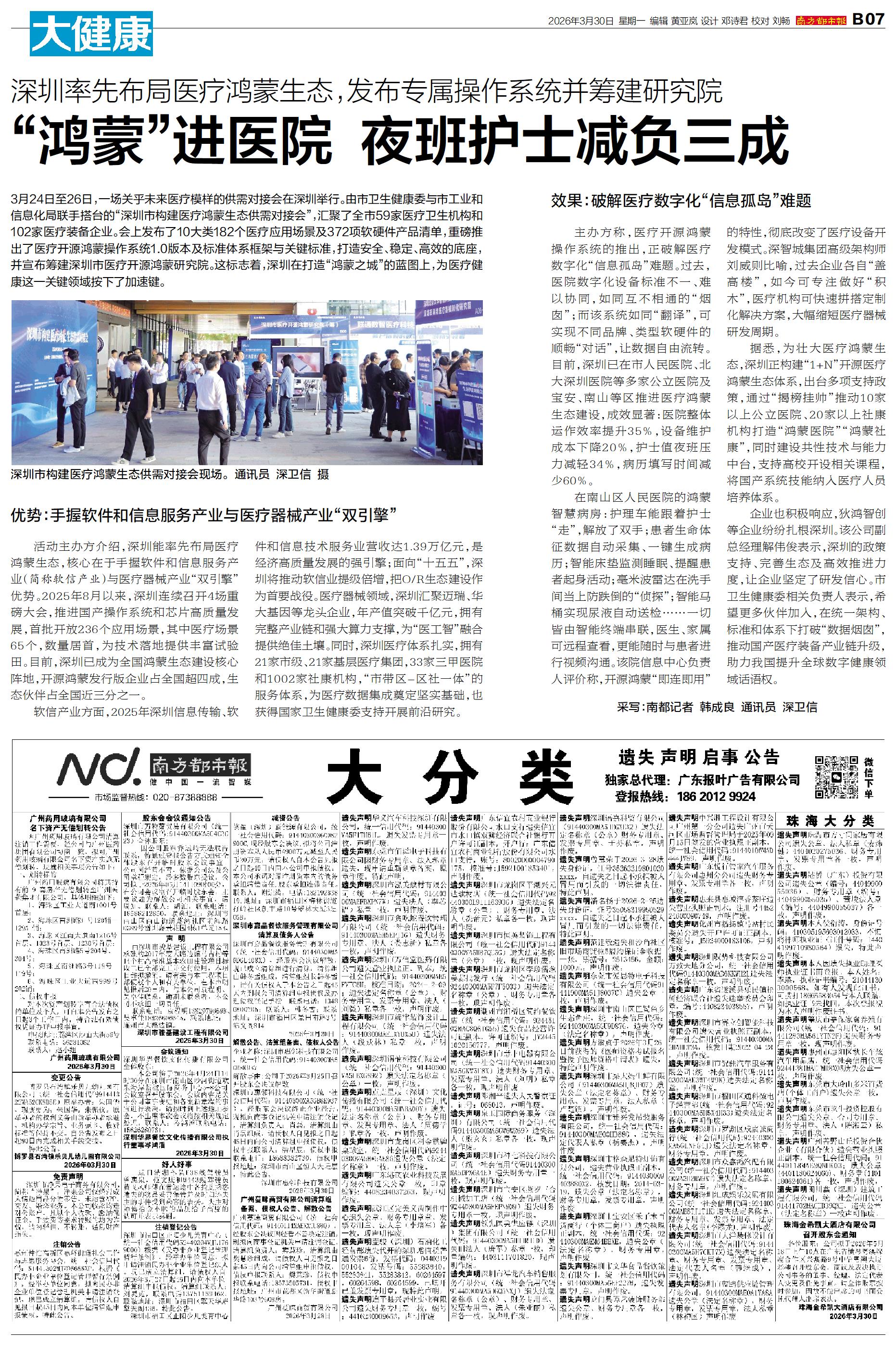 3月24日至26日,一场关乎未来医疗模样的供需对接会在深圳举行。由市卫生健康委与市工业和信息化局联手搭台的“深圳市构建医疗鸿蒙生态供需对接会”,汇聚了全市59家医疗卫生机构和102家医疗装备企业。