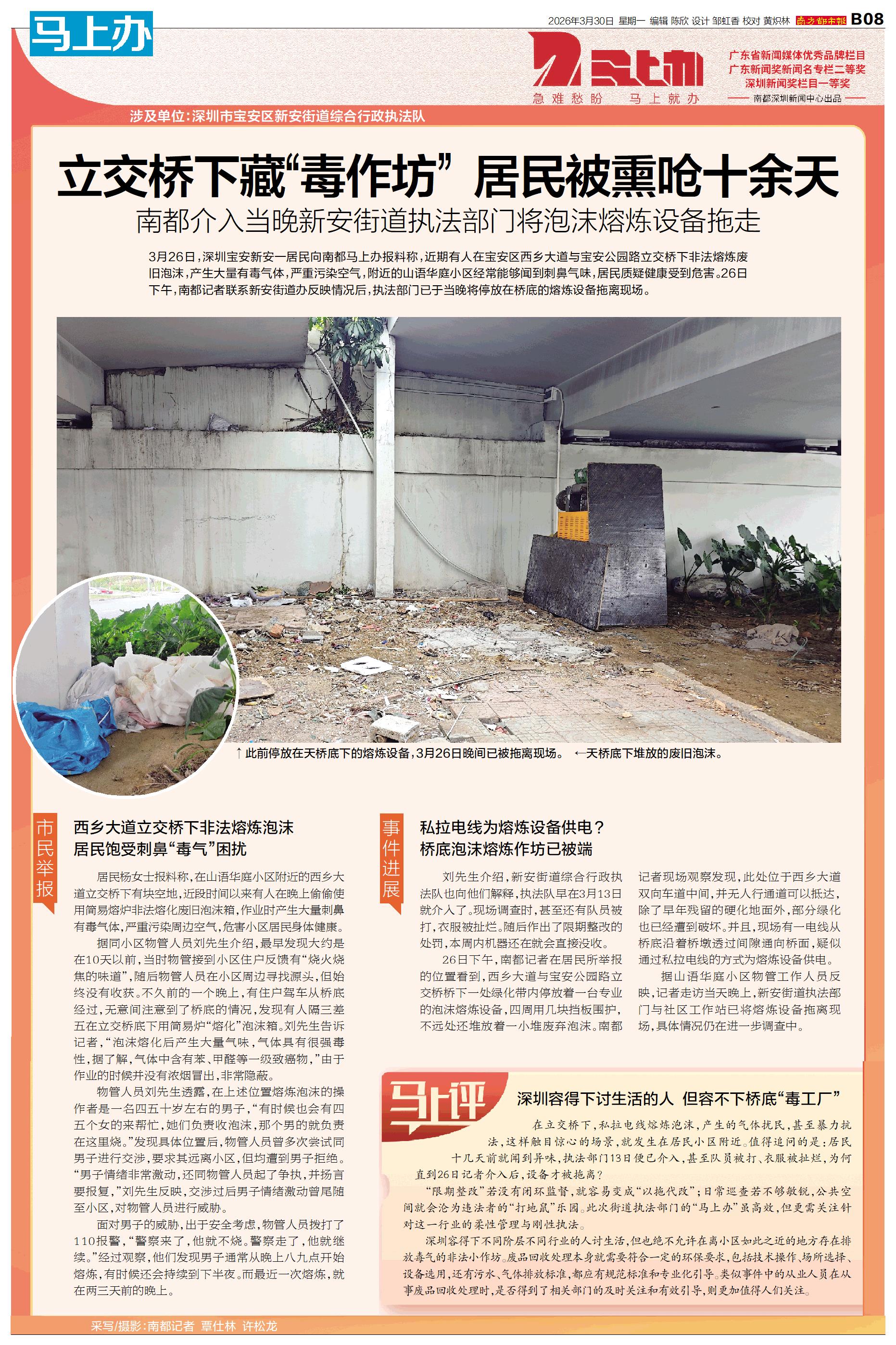涉及单位:深圳市宝安区新安街道综合行政执法队 3月26日,深圳宝安新安一居民向南都马上办报料称,近期有人在宝安区西乡大道与宝安公园路立交桥下非法熔炼废旧泡沫,产生大量有毒气体,严重污染空气,附近