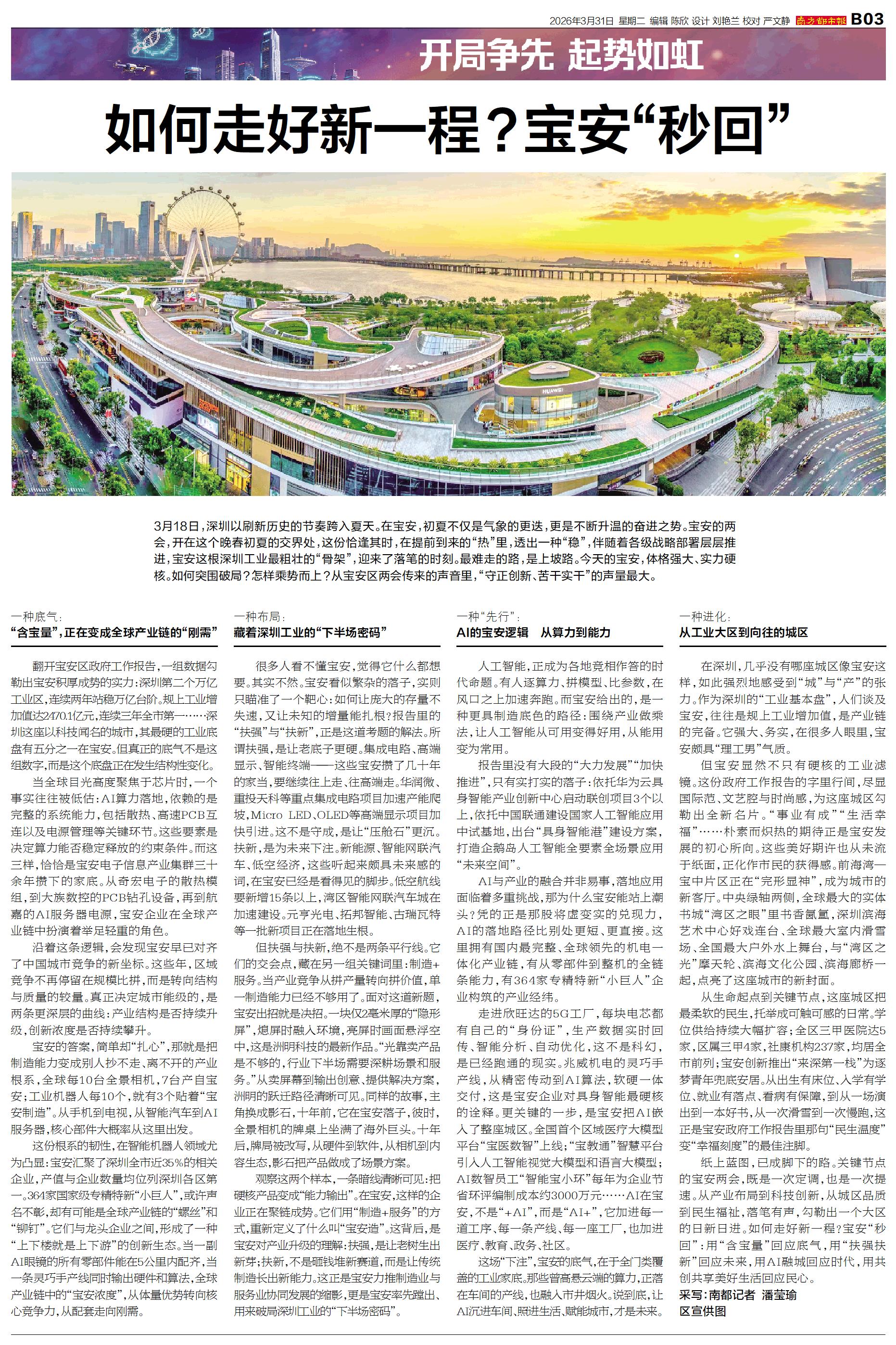 3月18日,深圳以刷新历史的节奏跨入夏天。在宝安,初夏不仅是气象的更迭,更是不断升温的奋进之势。宝安的两会,开在这个晚春初夏的交界处,这份恰逢其时,在提前到来的“热”里,透出一种“稳”,伴随着各级