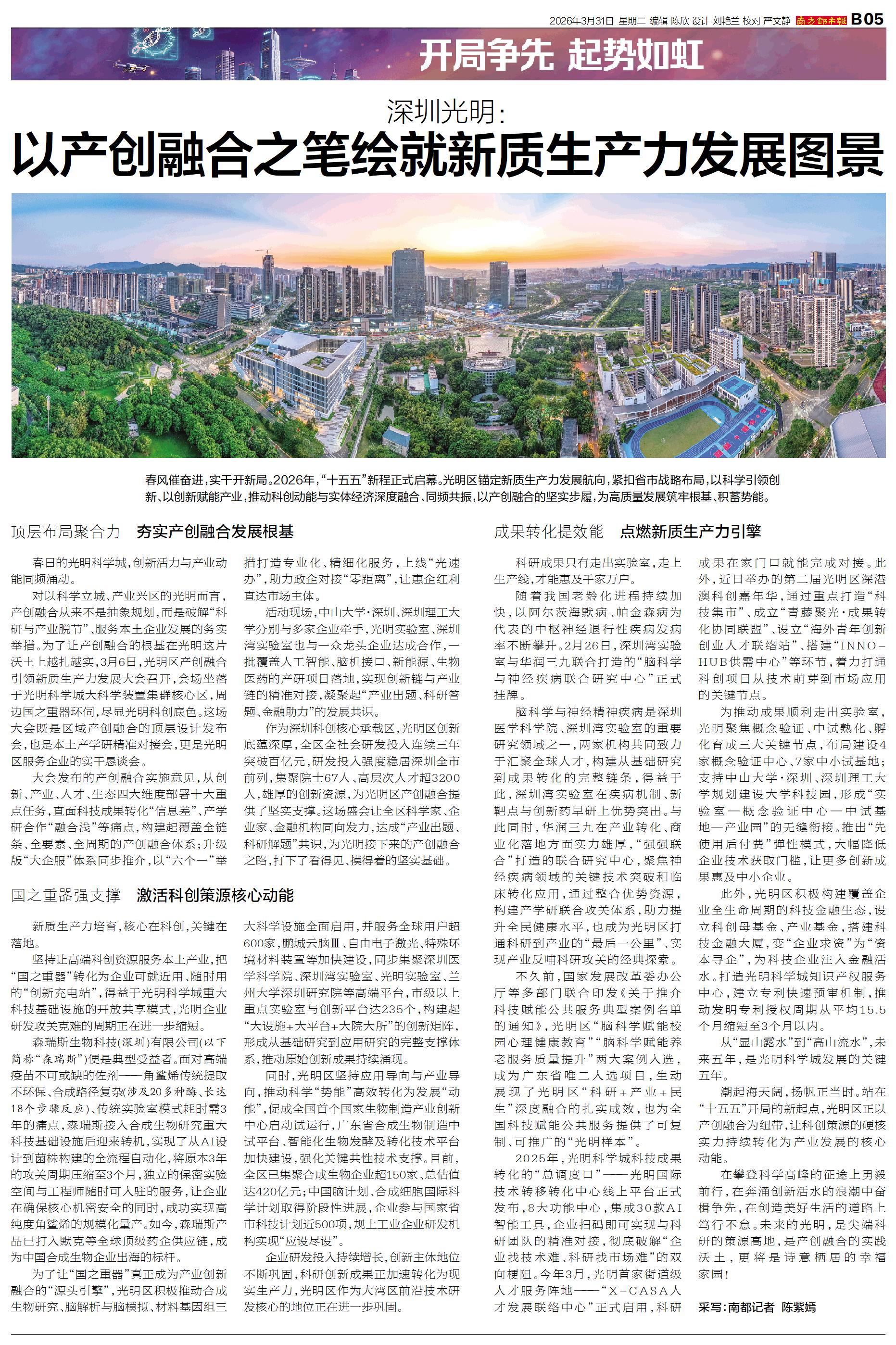 春风催奋进,实干开新局。2026年,“十五五”新程正式启幕。光明区锚定新质生产力发展航向,紧扣省市战略布局,以科学引领创新、以创新赋能产业,推动科创动能与实体经济深度融合、同频共振,以产创融合的坚