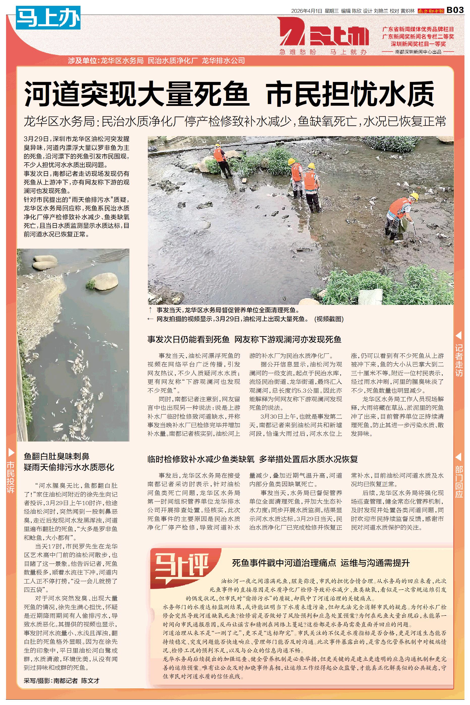 涉及单位:龙华区水务局 民治水质净化厂 龙华排水公司 3月29日,深圳市龙华区油松河突发腥臭异味,河道内漂浮大量以罗非鱼为主的死鱼,沿河漂下的死鱼引发市民围观,不少人担忧河水水质出现问题。 事