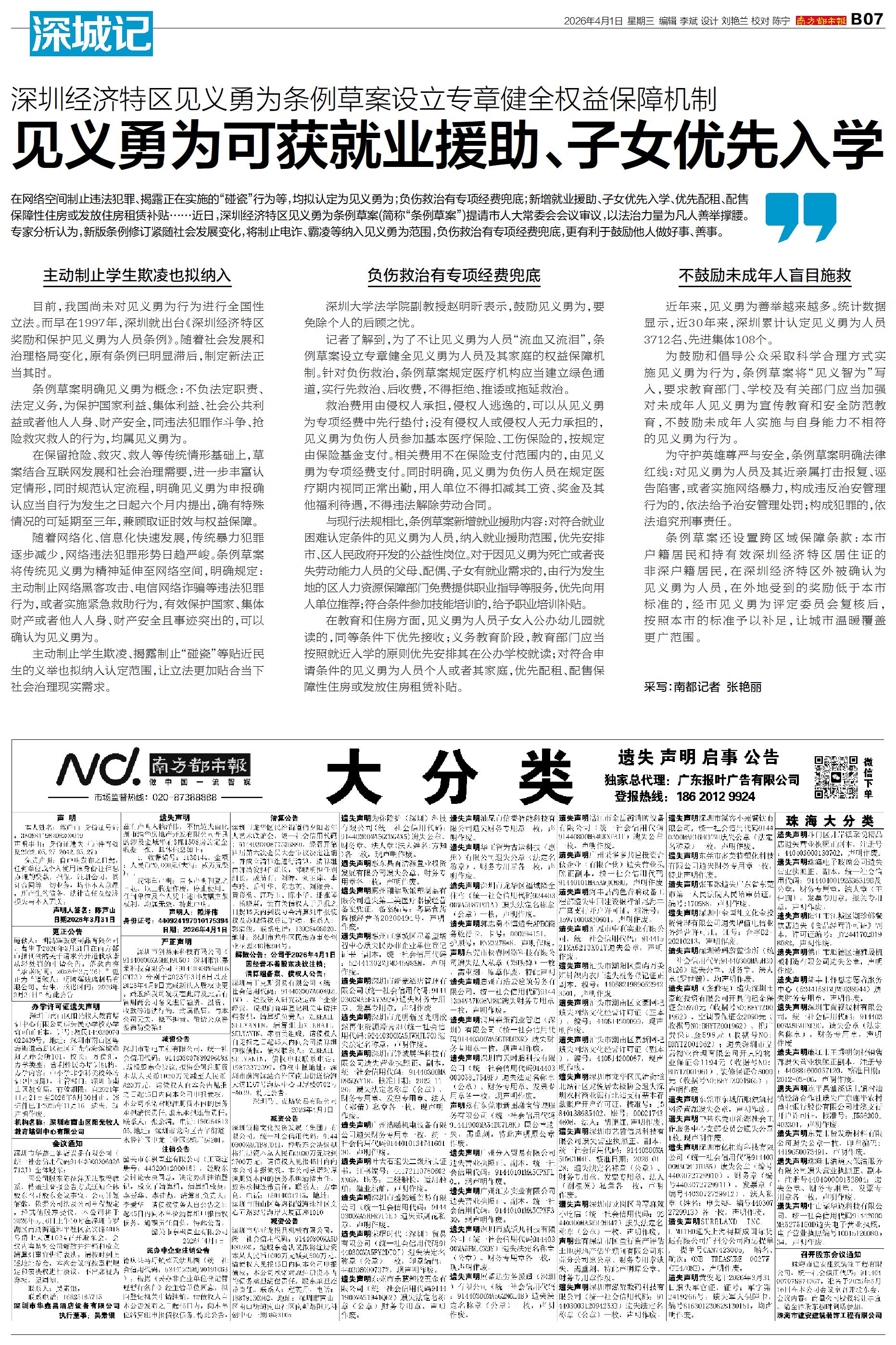 在网络空间制止违法犯罪、揭露正在实施的“碰瓷”行为等,均拟认定为见义勇为;负伤救治有专项经费兜底;新增就业援助、子女优先入学、优先配租、配售保障性住房或发放住房租赁补贴……近日,深圳经济特区见义勇