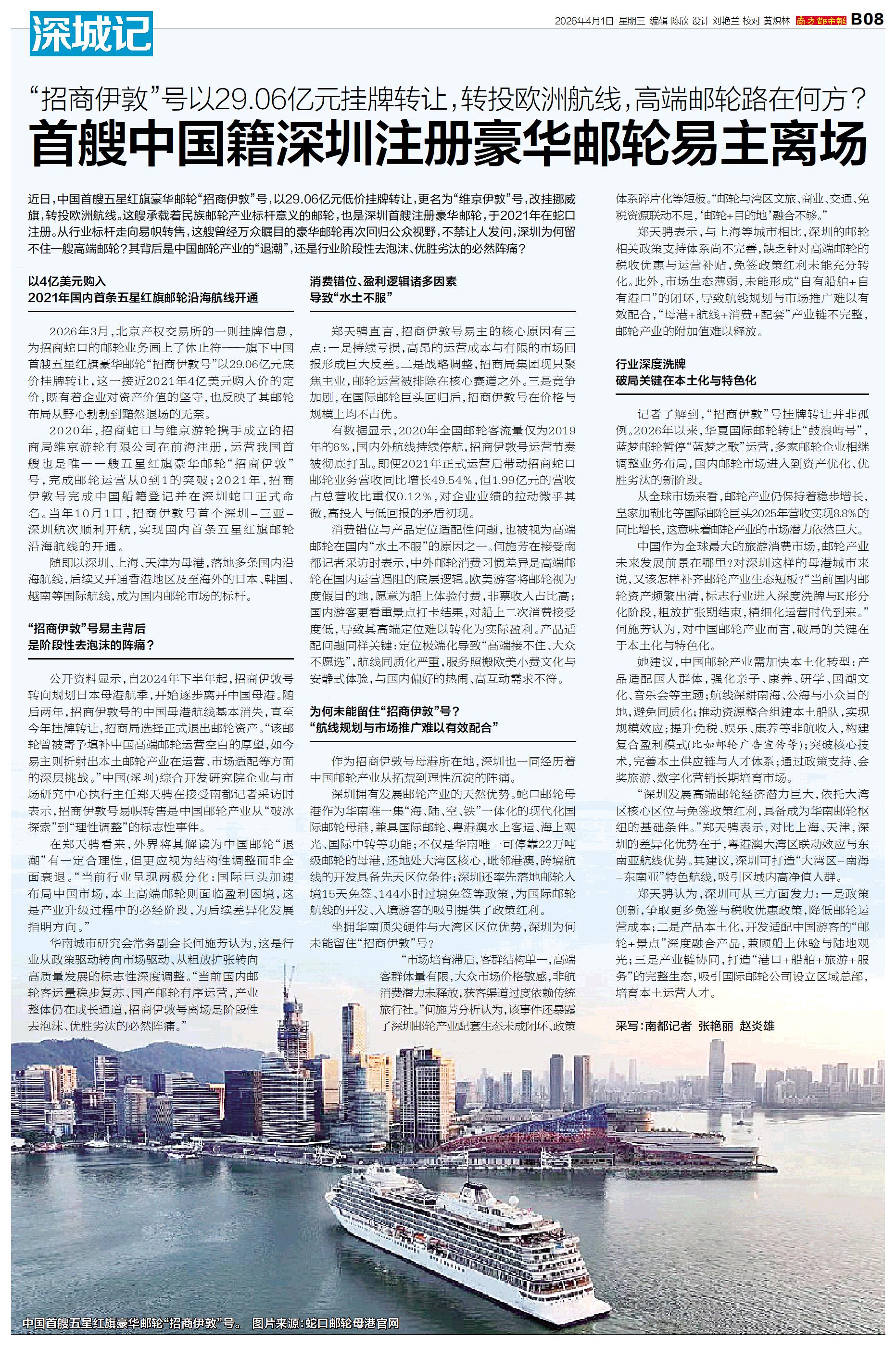 中国首艘五星红旗豪华邮轮“招商伊敦”号。 图片来源:蛇口邮轮母港官网 近日,中国首艘五星红旗豪华邮轮“招商伊敦”号,以29.06亿元低价挂牌转让,更名为“维京伊敦”号,
