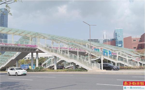 线条利落的结构、通透的玻璃雨棚、盛放的三角梅错落点缀……单看外观,这座横跨泥岗西路的人行天桥,与周边干净整洁的道路环境相得益彰,形成鲜明对比,称得上是一座现代感十足的城市景观天桥。