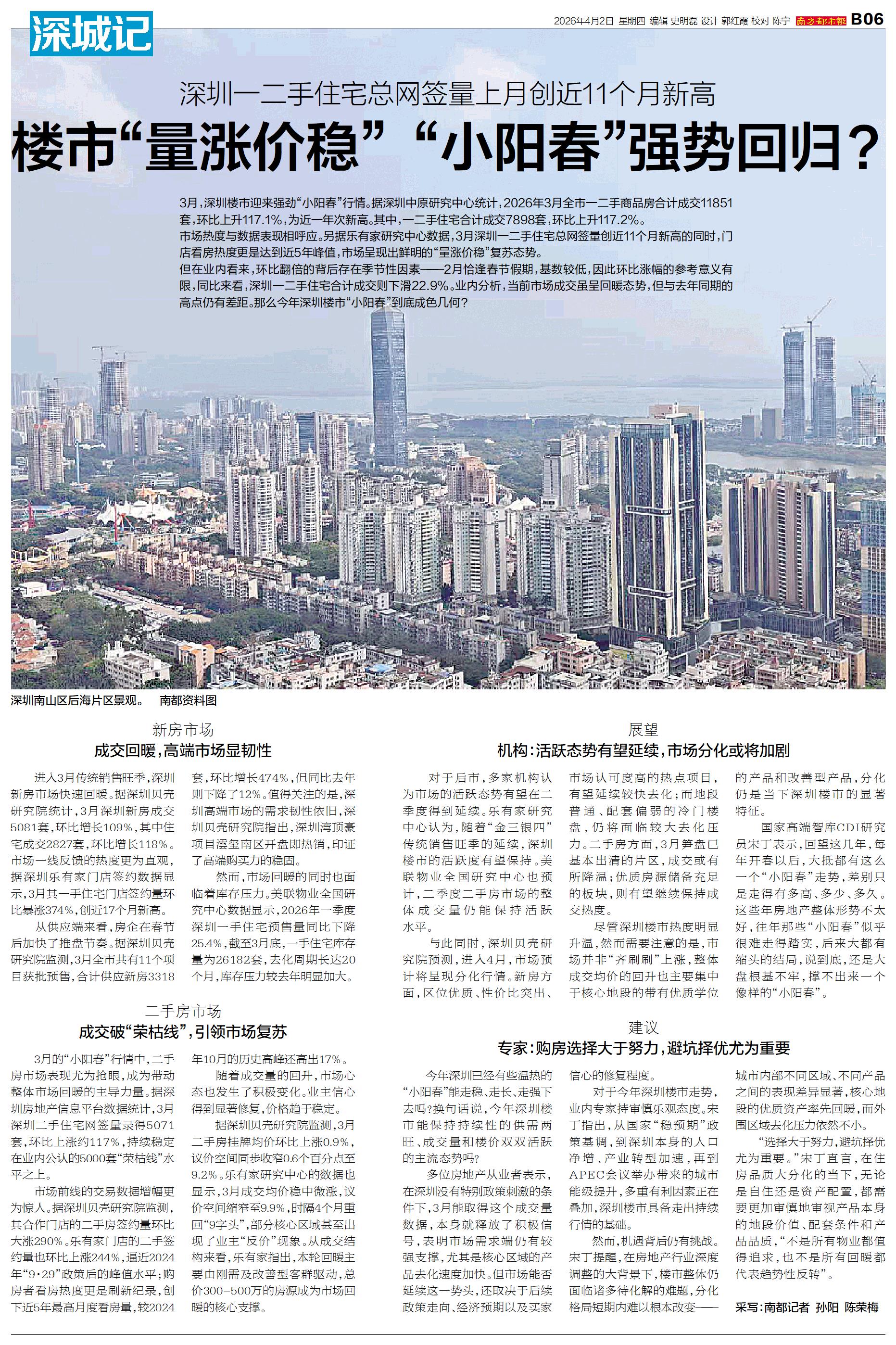 3月,深圳楼市迎来强劲“小阳春”行情。据深圳中原研究中心统计,2026年3月全市一二手商品房合计成交11851套,环比上升117.1%,为近一年次新高。其中,一二手住宅合计成交7898套,环比上升