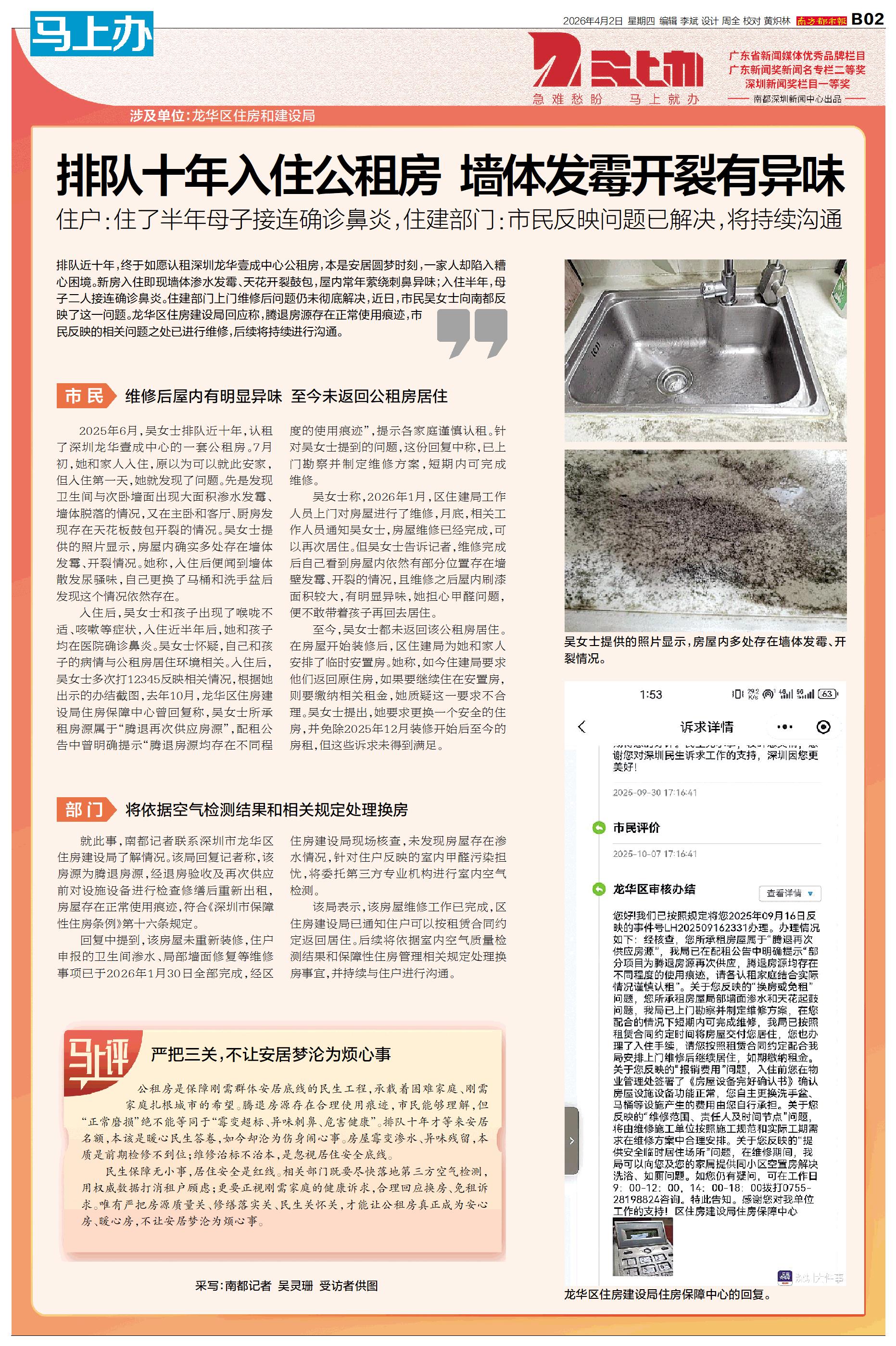 涉及单位:龙华区住房和建设局 排队近十年,终于如愿认租深圳龙华壹成中心公租房,本是安居圆梦时刻,一家人却陷入糟心困境。新房入住即现墙体渗水发霉、天花开裂鼓包,屋内常年萦绕刺鼻异味;入住半年,母子