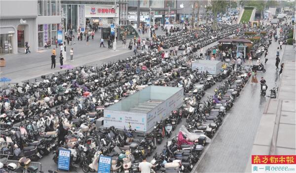4月1日,华强北步行街振中路至振华路之间,路中央设置了大片电动车停车区。(整改前)