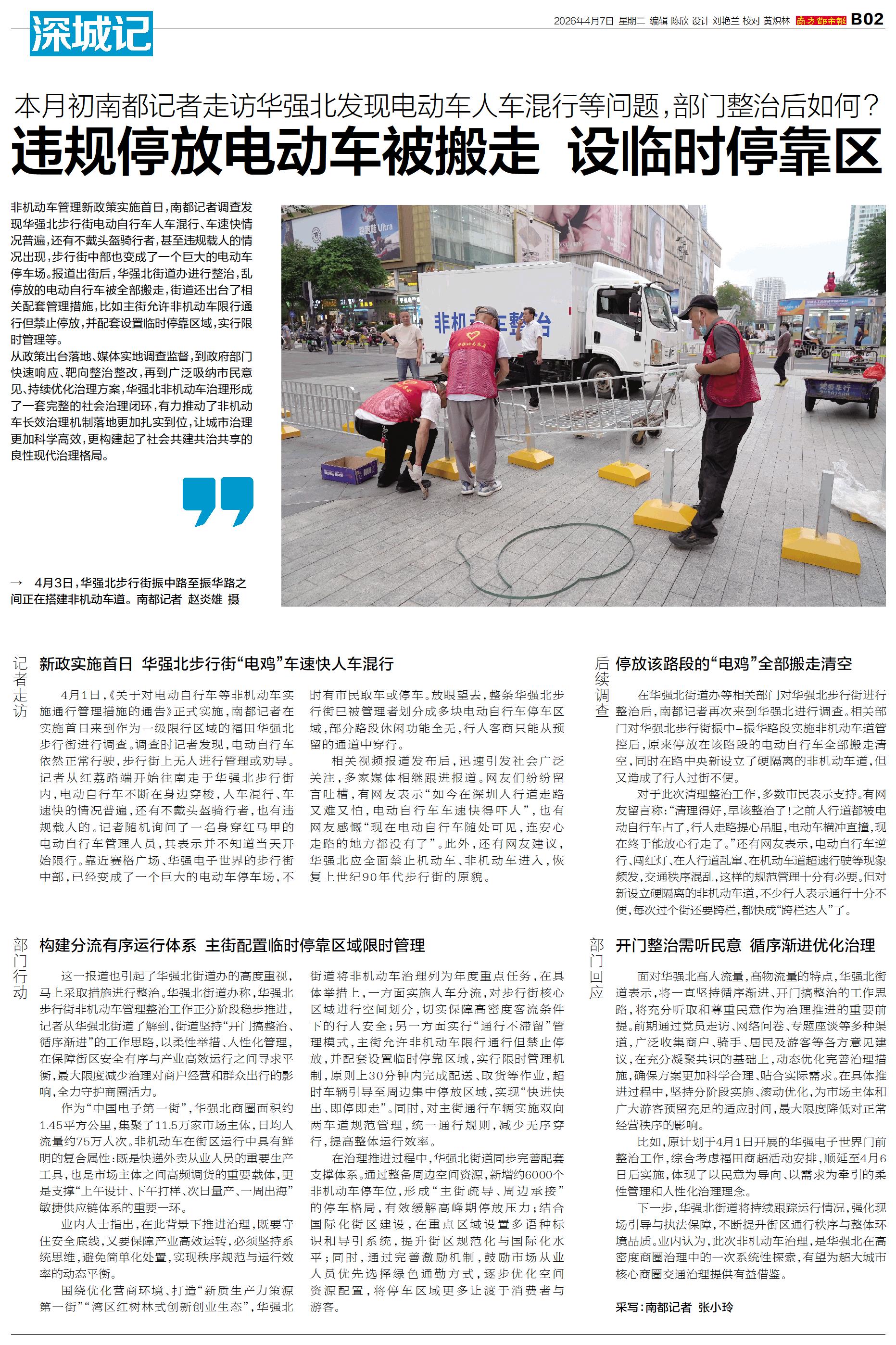 非机动车管理新政策实施首日,南都记者调查发现华强北步行街电动自行车人车混行、车速快情况普遍,还有不戴头盔骑行者,甚至违规载人的情况出现,步行街中部也变成了一个巨大的电动车停车场。报道出街后,华强北