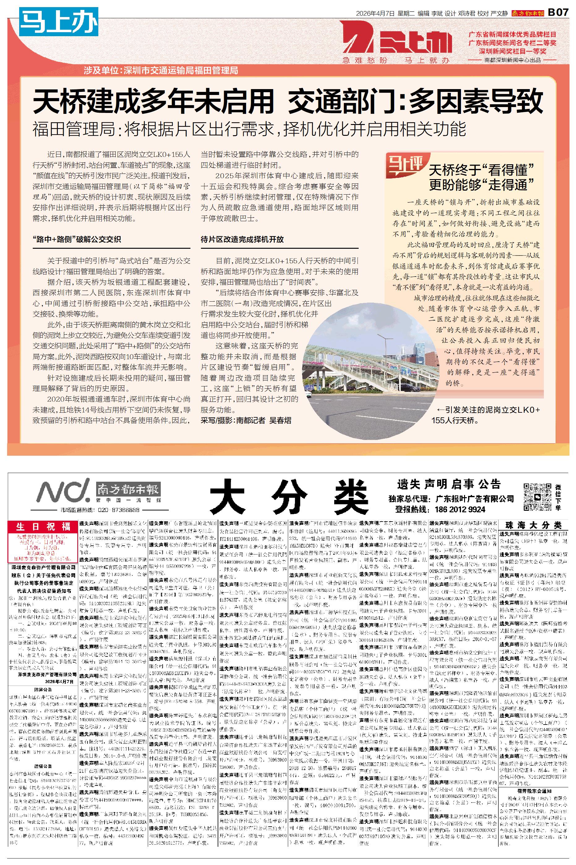 涉及单位:深圳市交通运输局福田管理局 近日,南都报道了福田区泥岗立交LK0+155人行天桥“引桥封闭、站台闲置、车道被占”的现象,这座“颜值在线”的天桥引发市民广泛关注。报道刊发后,深圳市交通运