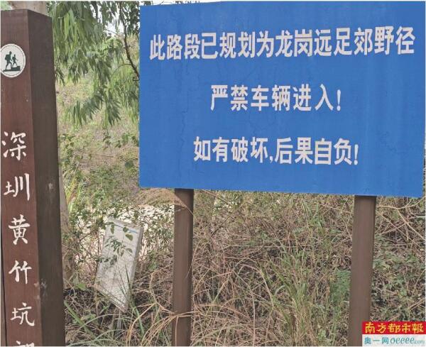 黄竹坑郊野径位于龙岗区坪地街道,其主要入口就在红花岭路的尽头。3月27日,记者前往该区域走访时,尚未抵达入口,就看到多辆越野摩托在红花岭路上穿梭。走到入口处,记者看到现场设有清晰的地名标示牌和郊野径地图,一旁的蓝色警示牌上明确写着“此路段已规划为龙岗远足郊野径 严禁车辆进入!如有破坏,后果自负!”