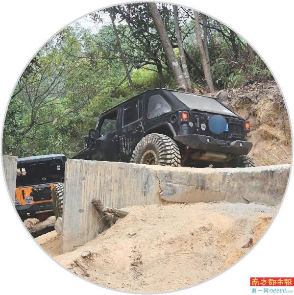 更令人意外的是,当天走访中,记者看到一辆越野汽车正翻越挡墙进入郊野径。由于右侧挡墙靠近山体,有土堆顺墙而下,大幅降低了挡墙高度,越野汽车借助土堆的坡度,轻松翻越挡墙。