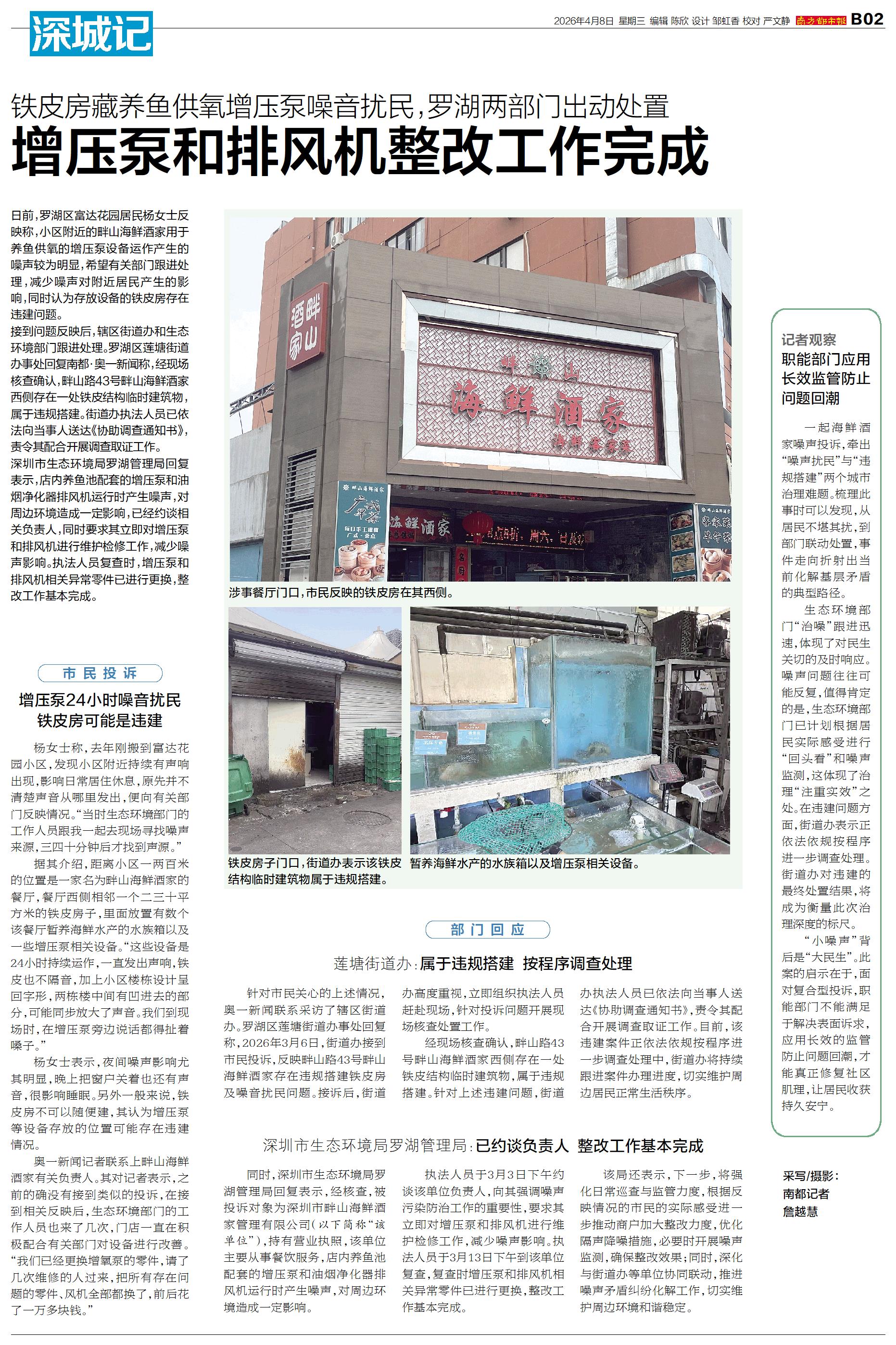 日前,罗湖区富达花园居民杨女士反映称,小区附近的畔山海鲜酒家用于养鱼供氧的增压泵设备运作产生的噪声较为明显,希望有关部门跟进处理,减少噪声对附近居民产生的影响,同时认为存放设备的铁皮房存在违建问题