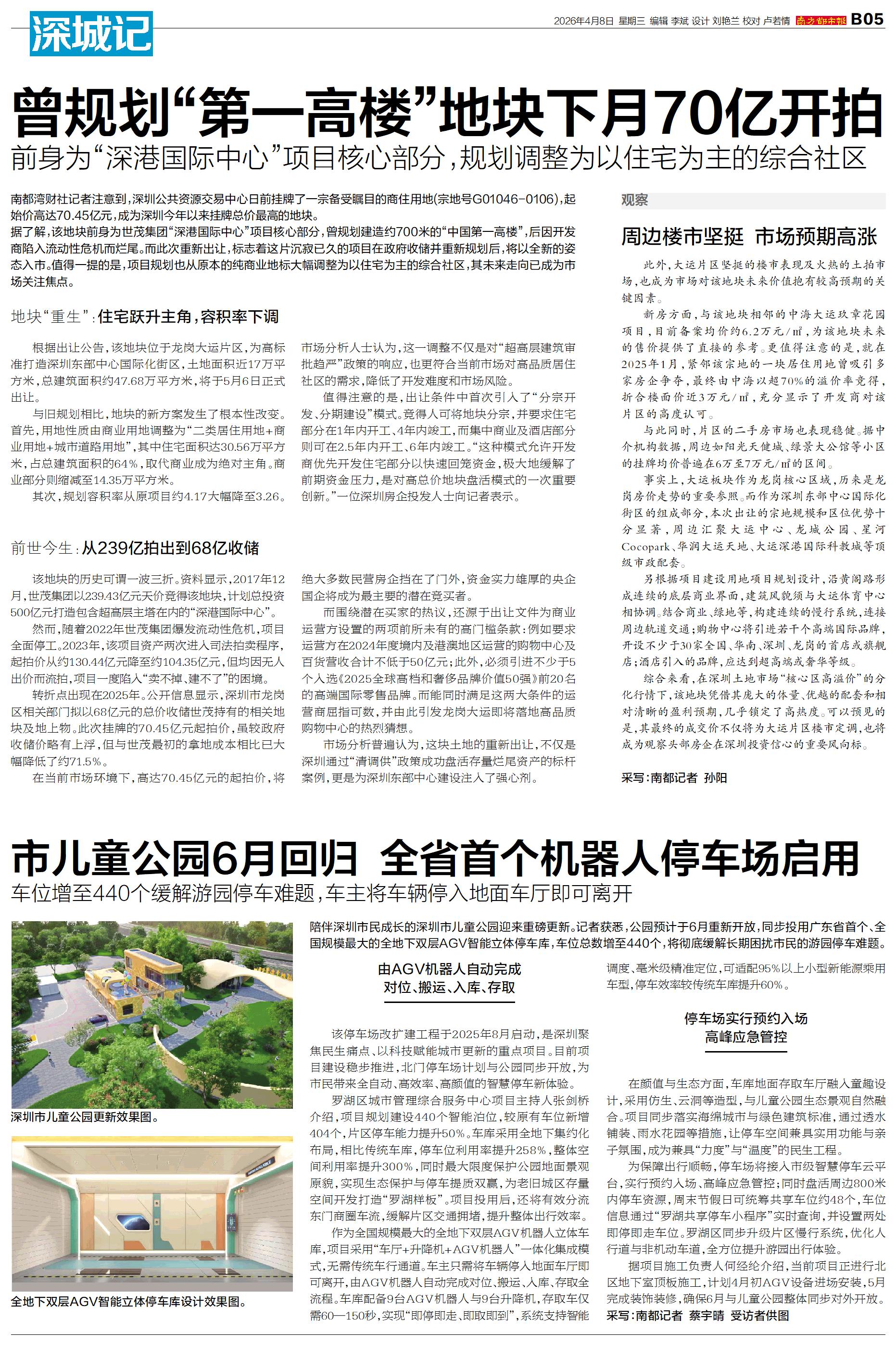陪伴深圳市民成长的深圳市儿童公园迎来重磅更新。记者获悉,公园预计于6月重新开放,同步投用广东省首个、全国规模最大的全地下双层AGV智能立体停车库,车位总数增至440个,将彻底缓解长期困扰市民的游园