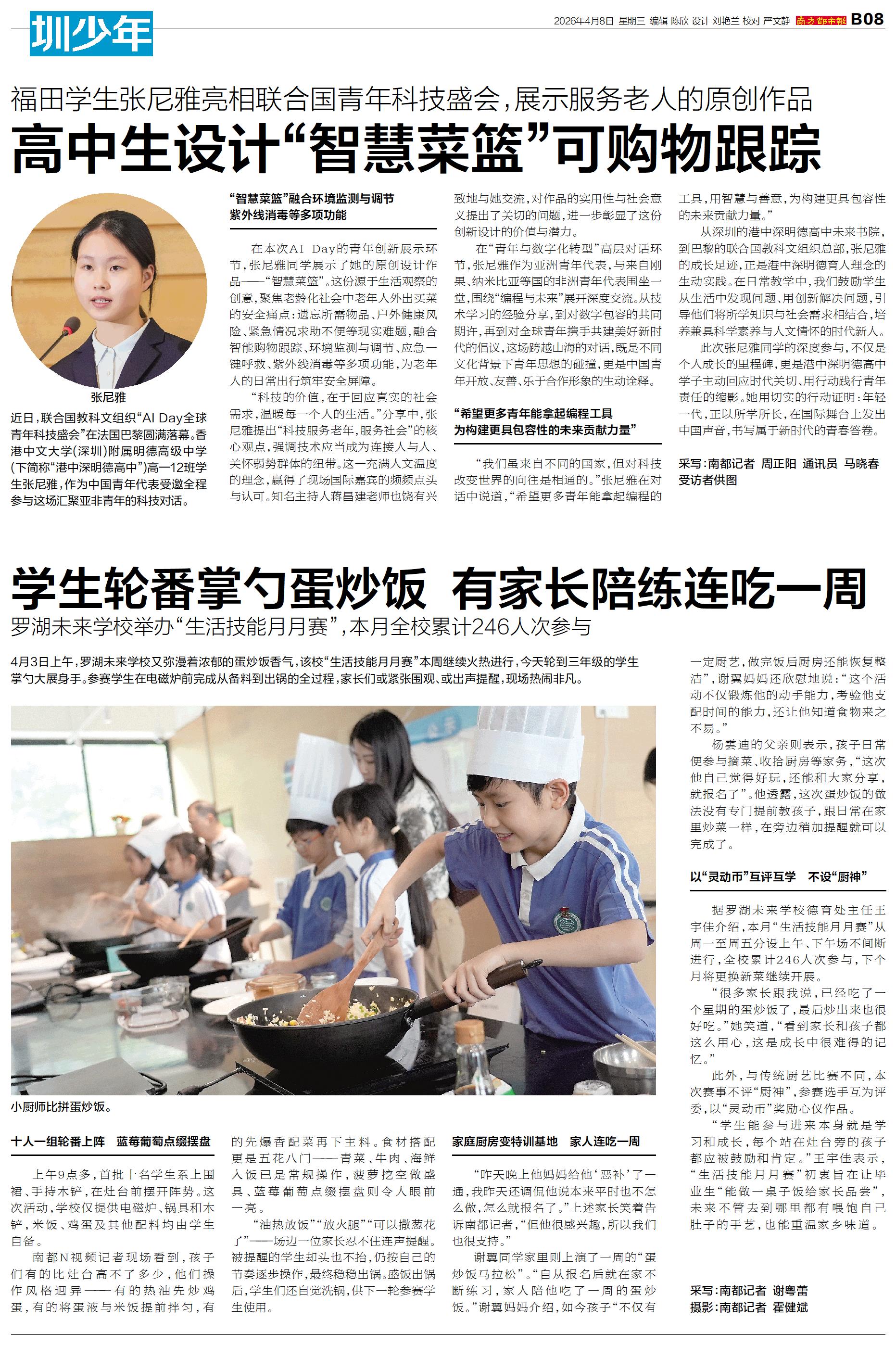 4月3日上午,罗湖未来学校又弥漫着浓郁的蛋炒饭香气,该校“生活技能月月赛”本周继续火热进行,今天轮到三年级的学生掌勺大展身手。参赛学生在电磁炉前完成从备料到出锅的全过程,家长们或紧张围观、或出声提