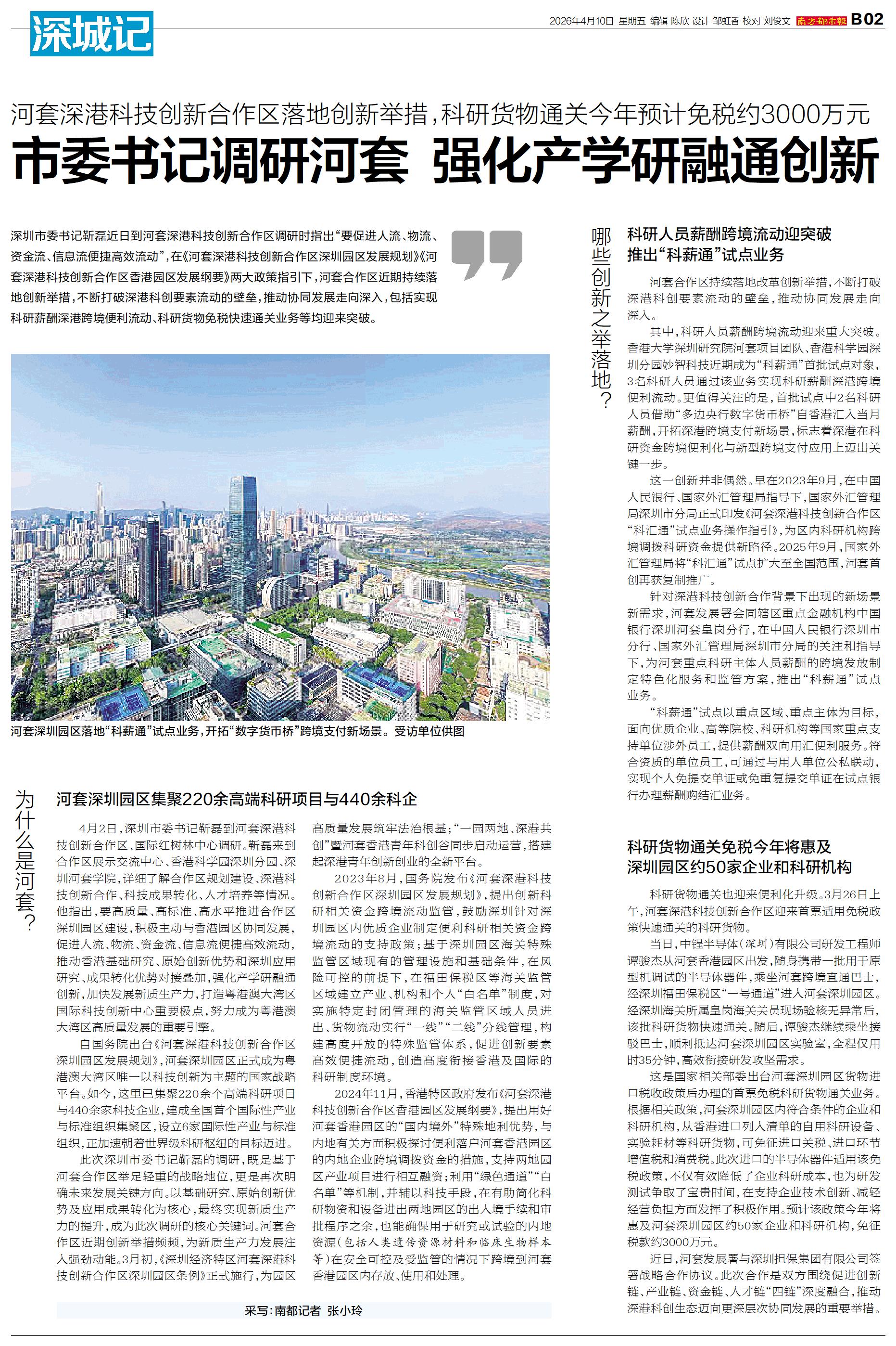深圳市委书记靳磊近日到河套深港科技创新合作区调研时指出“要促进人流、物流、资金流、信息流便捷高效流动”,在《河套深港科技创新合作区深圳园区发展规划》《河套深港科技创新合作区香港园区发展纲要》两大政