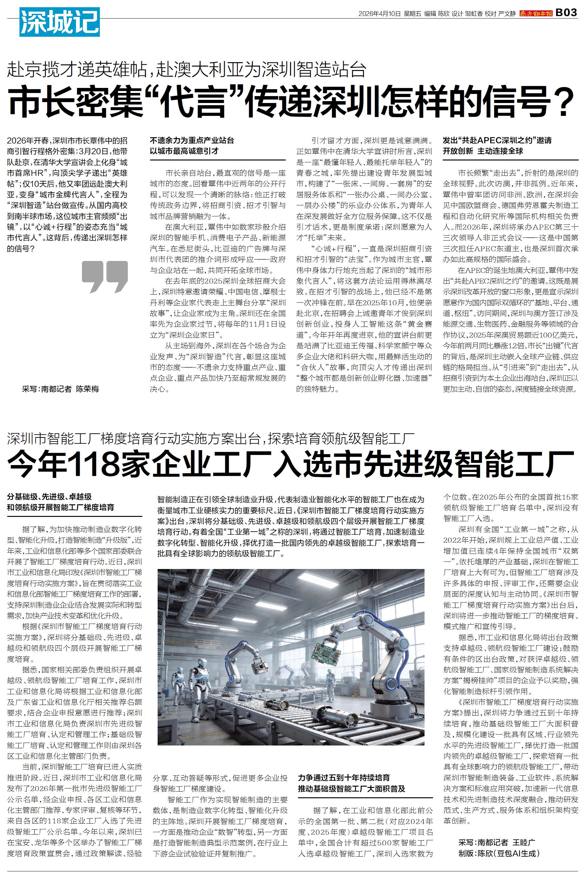 制版:陈欣(豆包AI生成) 智能制造正在引领全球制造业升级,代表制造业智能化水平的智能工厂也在成为衡量城市工业硬核实力的重要标尺。近日,《深圳市智能工厂梯度培育行动实施
