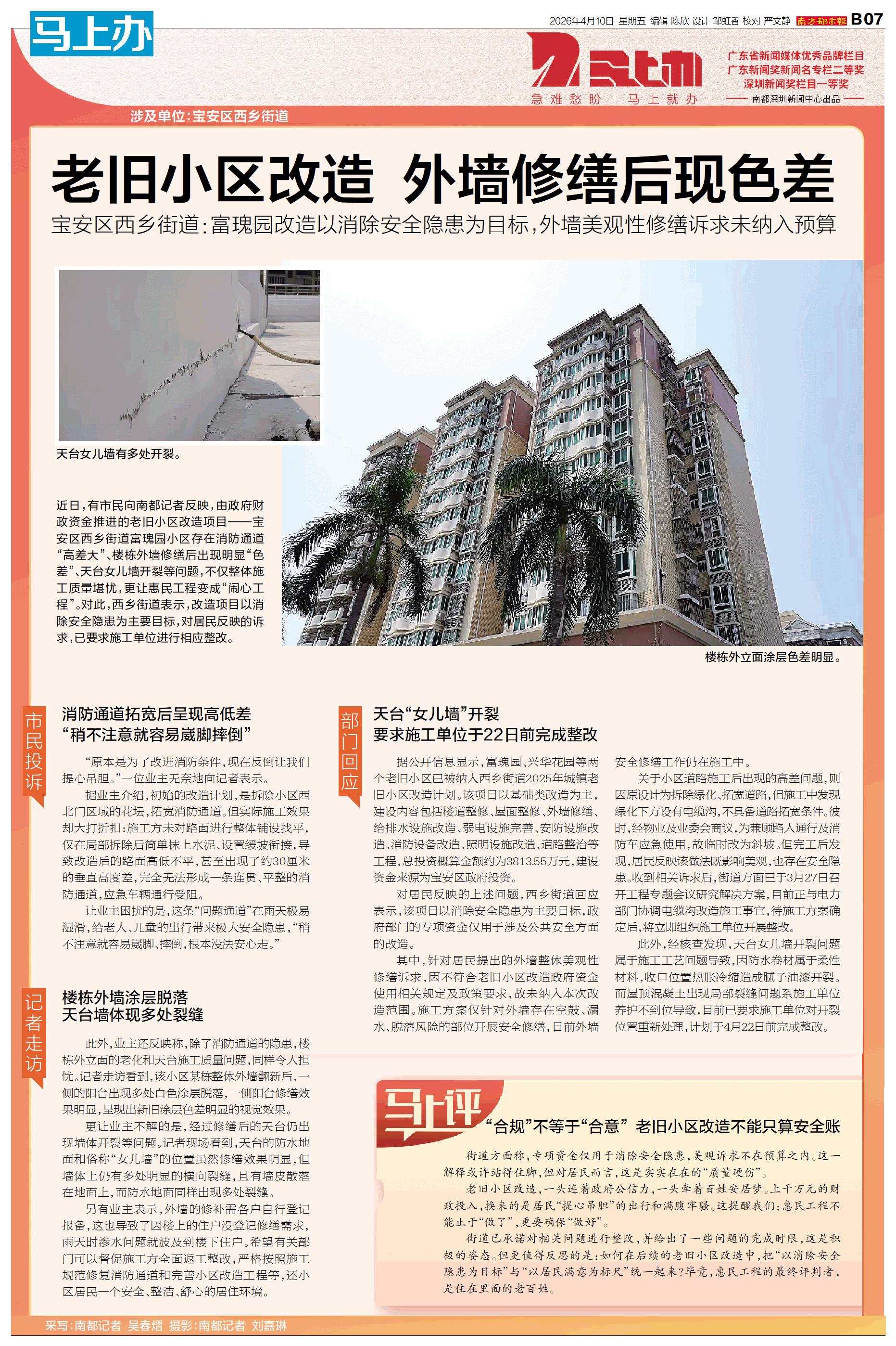 涉及单位:宝安区西乡街道 近日,有市民向南都记者反映,由政府财政资金推进的老旧小区改造项目——宝安区西乡街道富瑰园小区存在消防通道“高差大”、楼栋外墙修缮后出现明显“色差”、天台女儿墙开裂等问题