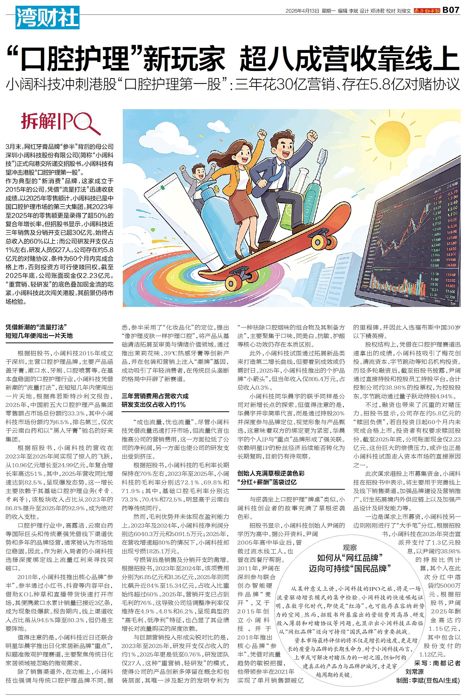 3月末,网红牙膏品牌“参半”背后的母公司深圳小阔科技股份有限公司(简称“小阔科技”)正式向港交所递交招股书。小阔科技有望冲击港股“口腔护理第一股”。 作为典型的“新消费”品牌,这家成立于2015