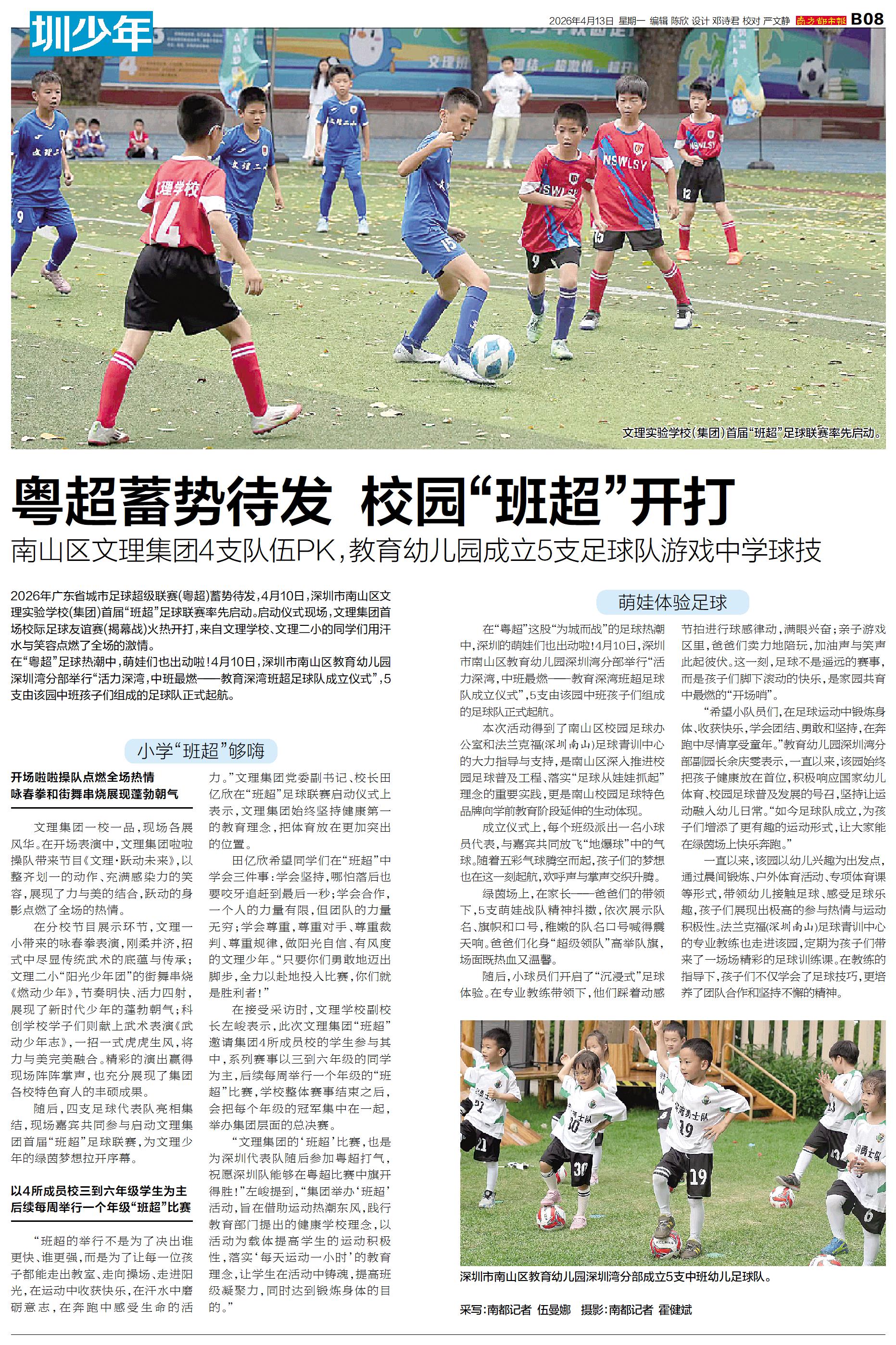 2026年广东省城市足球超级联赛(粤超)蓄势待发,4月10日,深圳市南山区文理实验学校(集团)首届“班超”足球联赛率先启动。启动仪式现场,文理集团首场校际足球友谊赛(揭幕战)火热开打,来自文理学校
