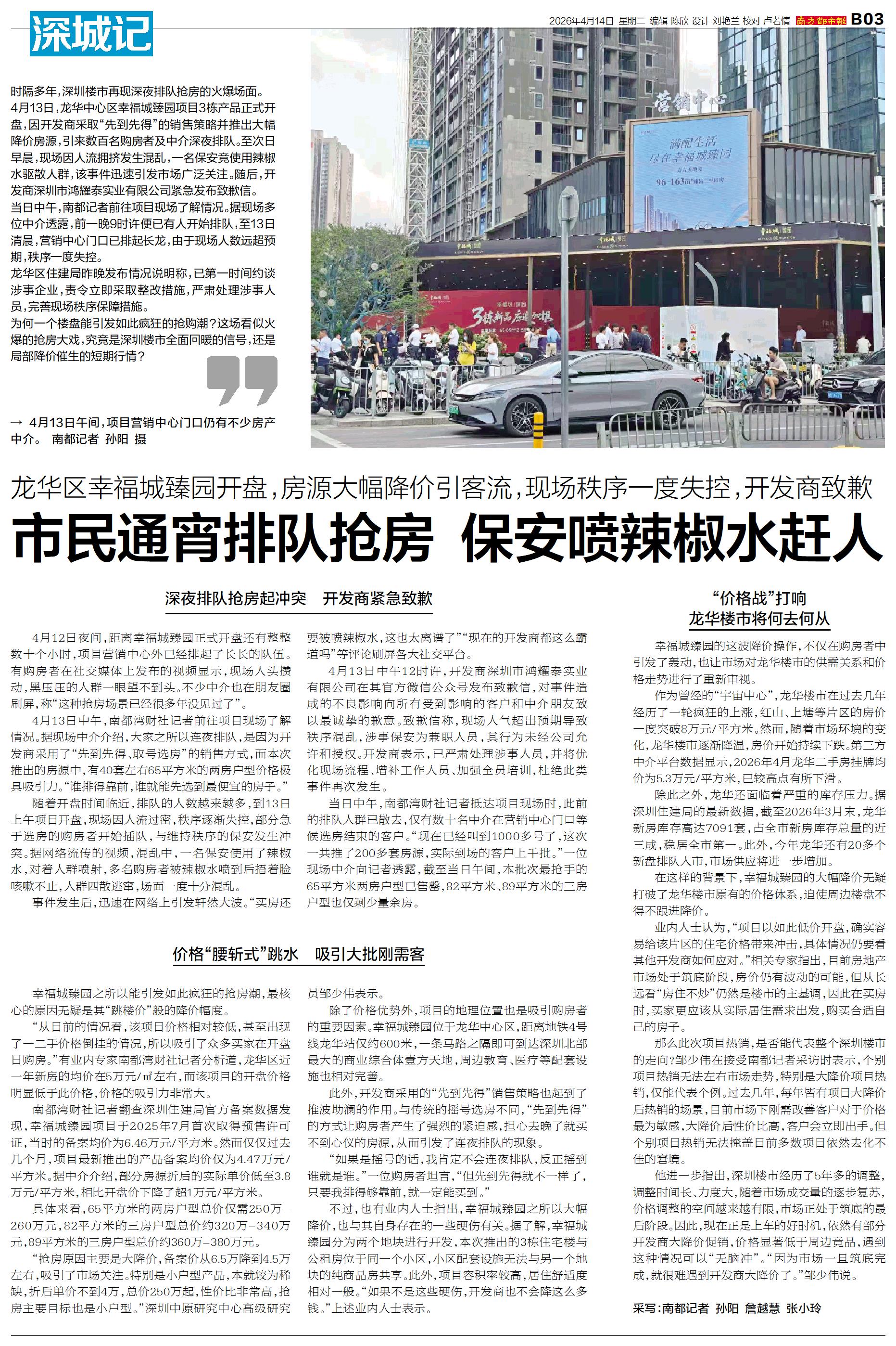 时隔多年,深圳楼市再现深夜排队抢房的火爆场面。 4月13日,龙华中心区幸福城臻园项目3栋产品正式开盘,因开发商采取“先到先得”的销售策略并推出大幅降价房源,引来数百名购房者及中介深夜排队。至次日