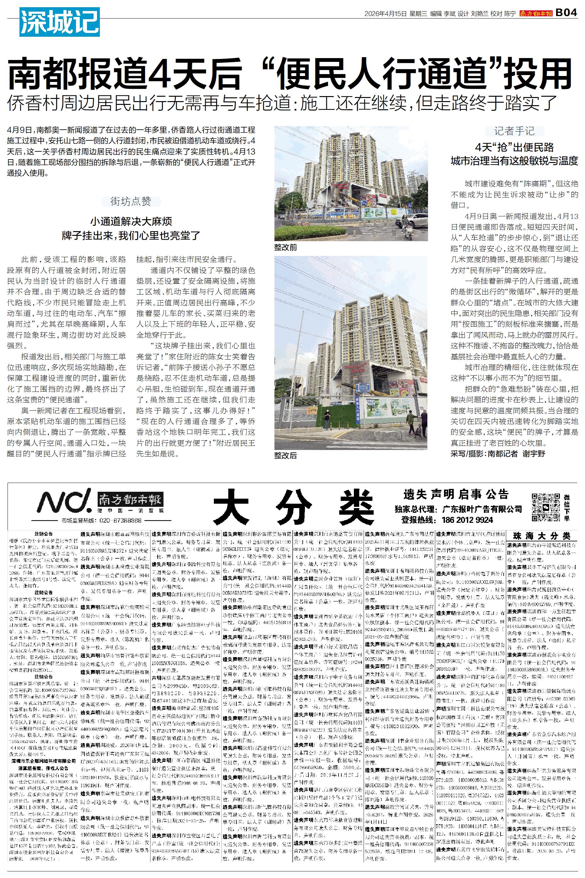 4月9日,南都奥一新闻报道了在过去的一年多里,侨香路人行过街通道工程施工过程中,安托山七路一侧的人行道封闭,市民被迫借道机动车道或绕行。4天后,这一关乎侨香村周边居民出行的民生痛点迎来了实质性转机