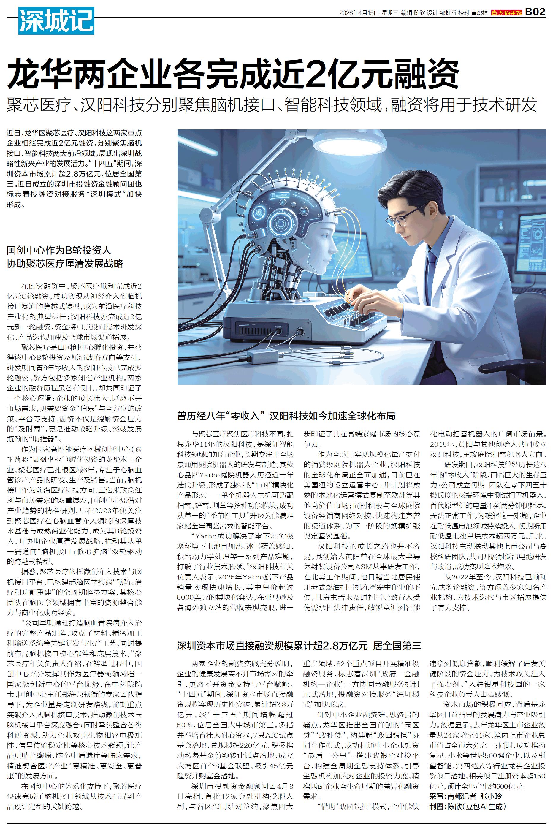 近日,龙华区聚芯医疗、汉阳科技这两家重点企业相继完成近2亿元融资,分别聚焦脑机接口、智能科技两大前沿领域,展现出深圳战略性新兴产业的发展活力。“十四五”期间,深圳资本市场累计超2.8万亿元,位居全