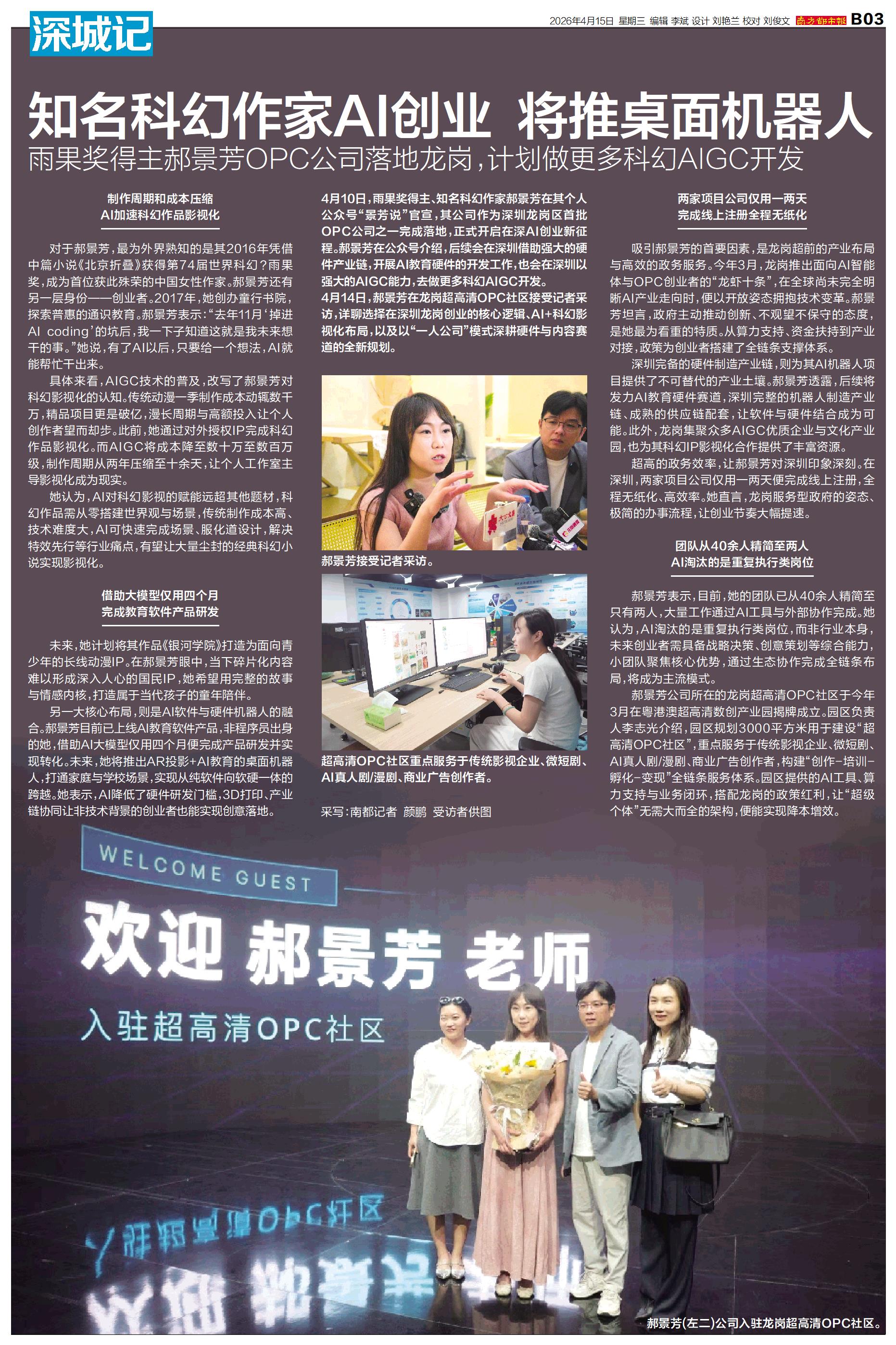 郝景芳(左二)公司入驻龙岗超高清OPC社区。 郝景芳接受记者采访。 超高清OPC社区重点服务于传统影视企业、微短剧、AI真人剧/漫剧、商业广