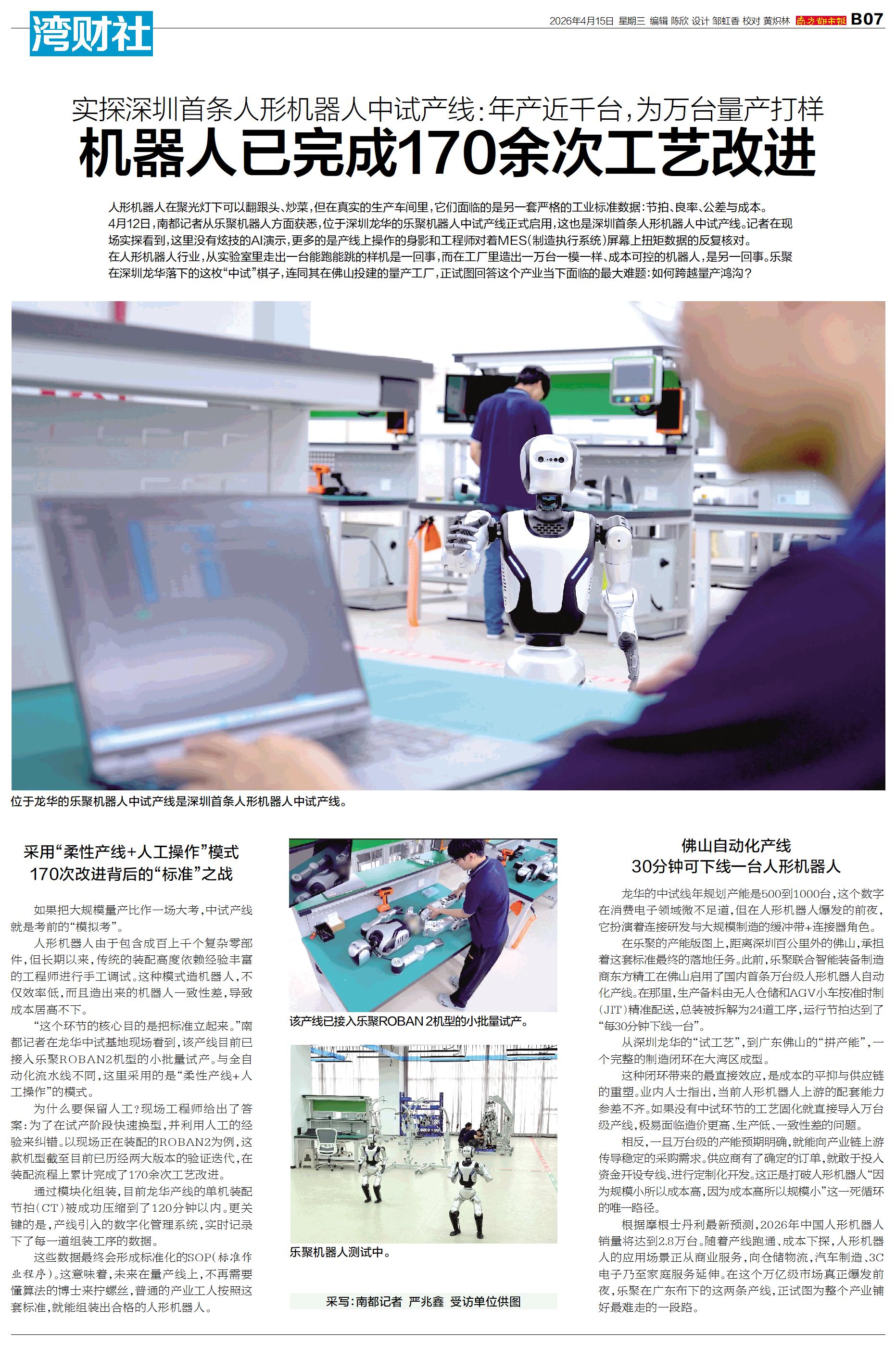 人形机器人在聚光灯下可以翻跟头、炒菜,但在真实的生产车间里,它们面临的是另一套严格的工业标准数据:节拍、良率、公差与成本。 4月12日,南都记者从乐聚机器人方面获悉,位于深圳龙华的乐聚机器人中试