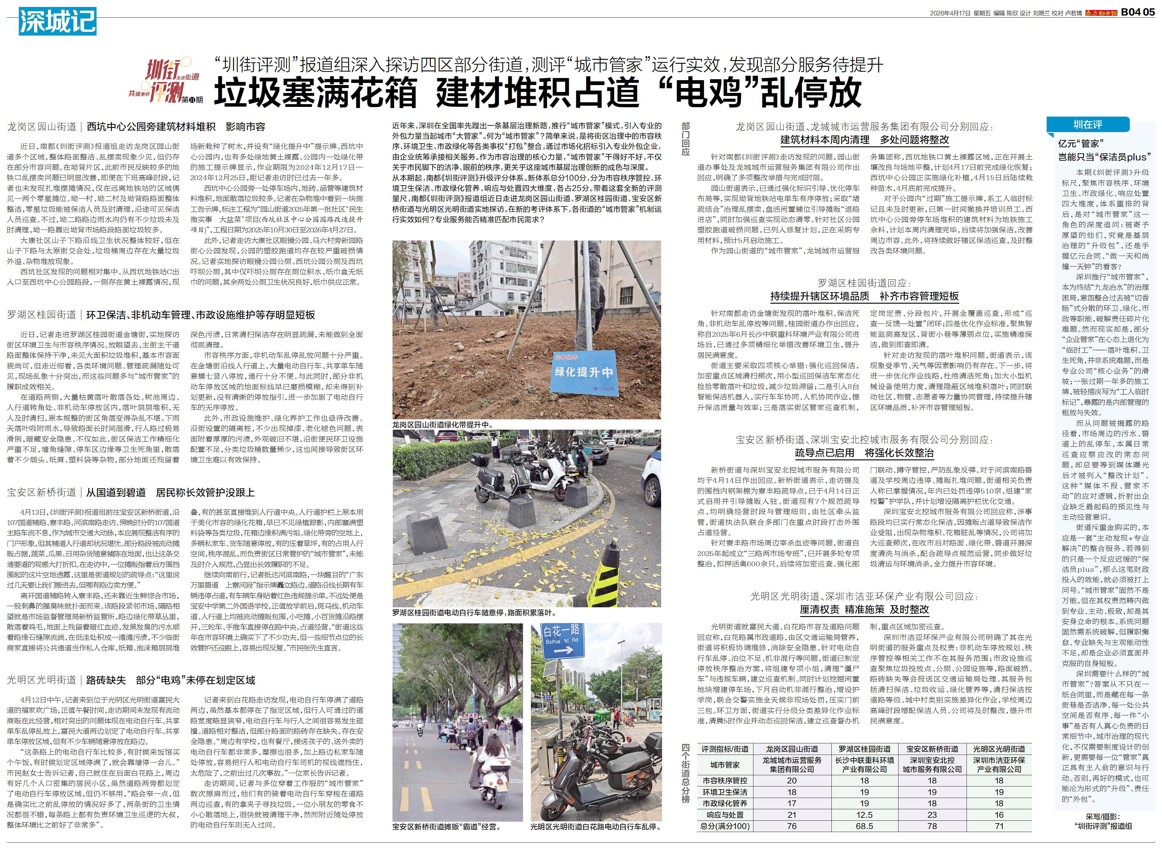 龙岗区园山街道绿化带提升中。 罗湖区桂园街道电动自行车随意停,路面积累落叶。 宝安区新桥街道摊贩“霸道”经营。 光明
