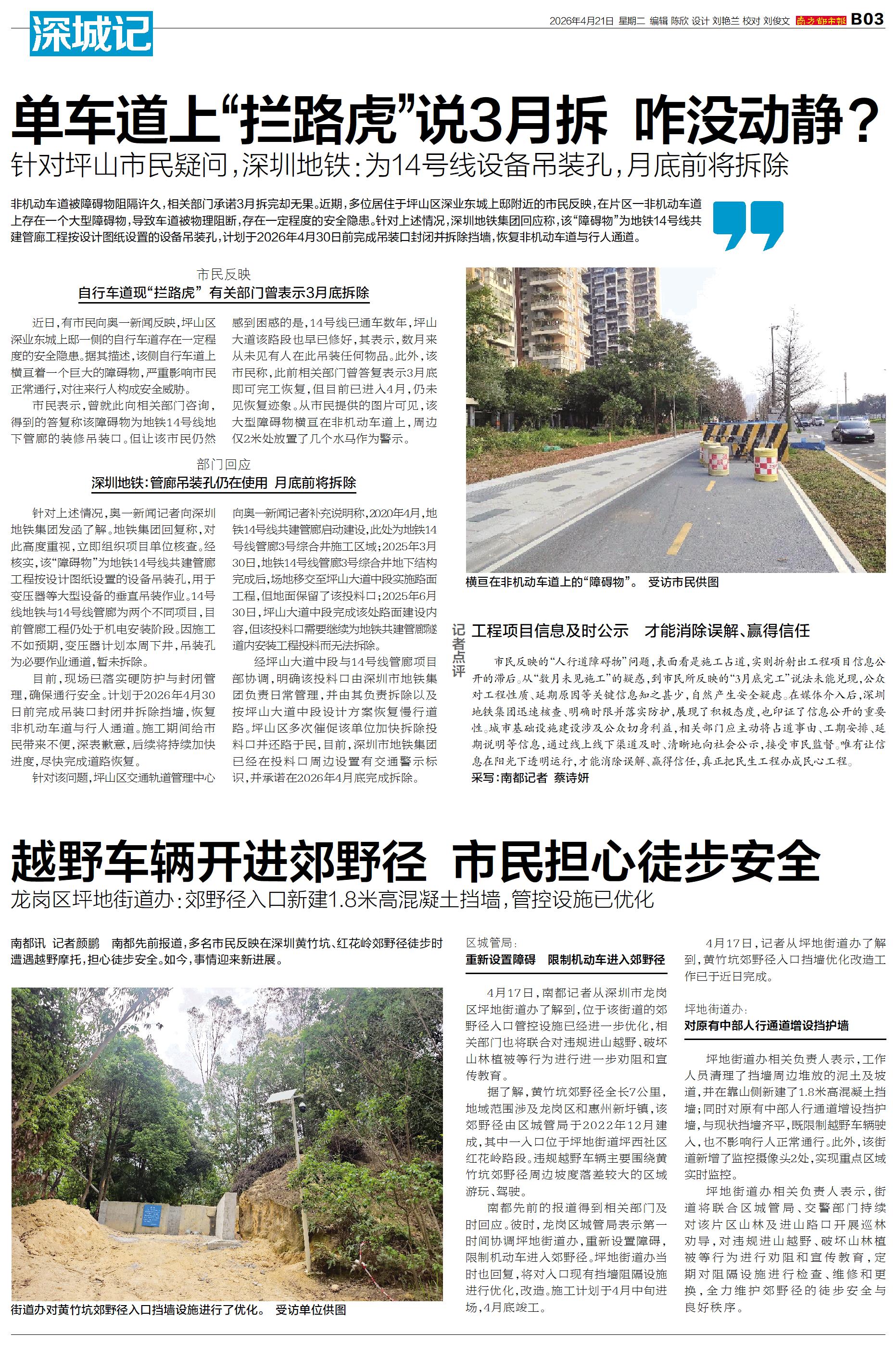 南都讯 记者颜鹏 南都先前报道,多名市民反映在深圳黄竹坑、红花岭郊野径徒步时遭遇越野摩托,担心徒步安全。如今,事情迎来新进展。 区城管局: 重新设置障碍 限制机动车进入郊野径 4月17日