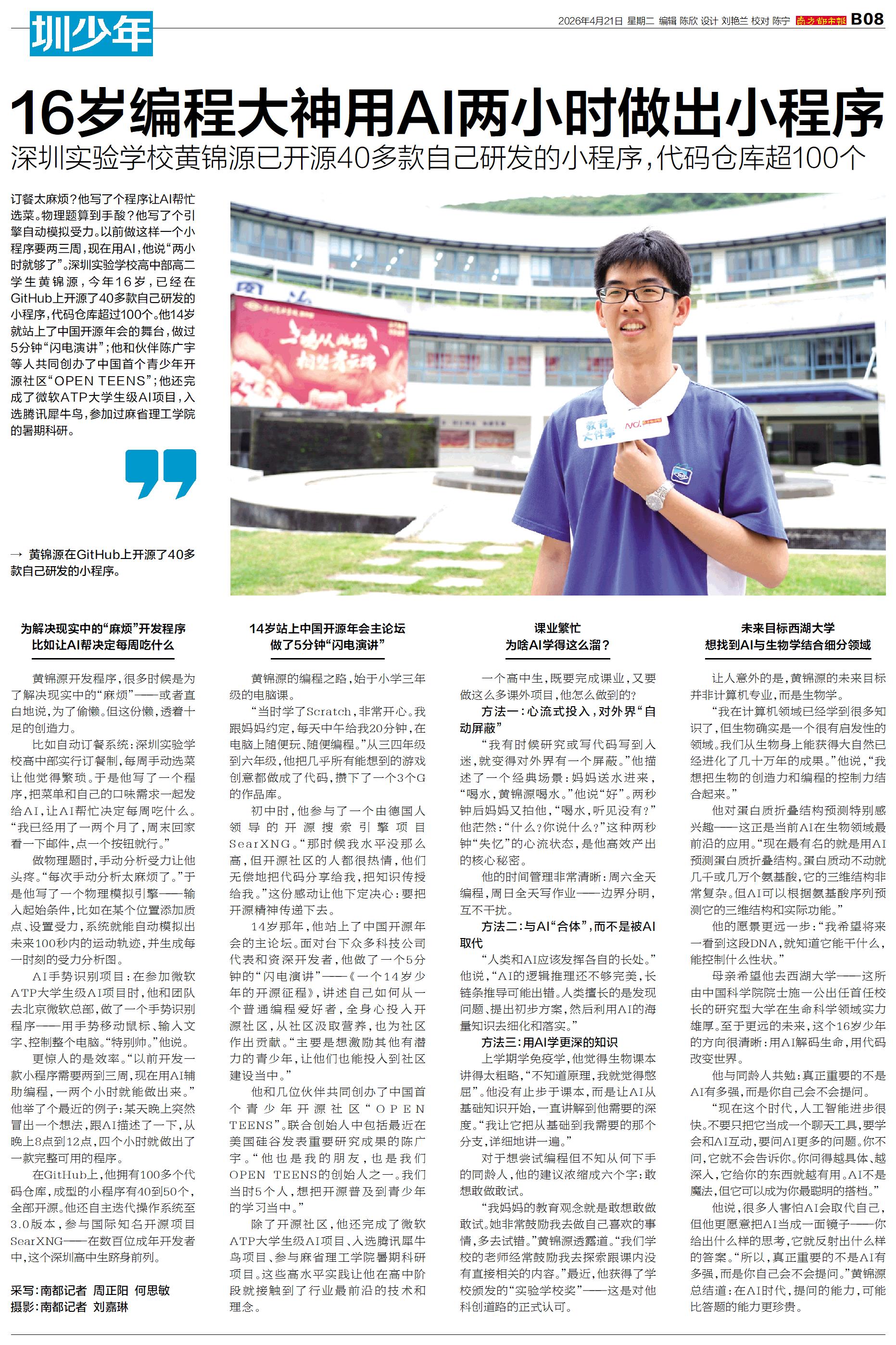 订餐太麻烦?他写了个程序让AI帮忙选菜。物理题算到手酸?他写了个引擎自动模拟受力。以前做这样一个小程序要两三周,现在用AI,他说“两小时就够了”。深圳实验学校高中部高二学生黄锦源,今年16岁,已经