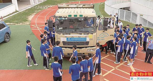 活动现场,一辆大型泥头车引来同学们好奇的目光。