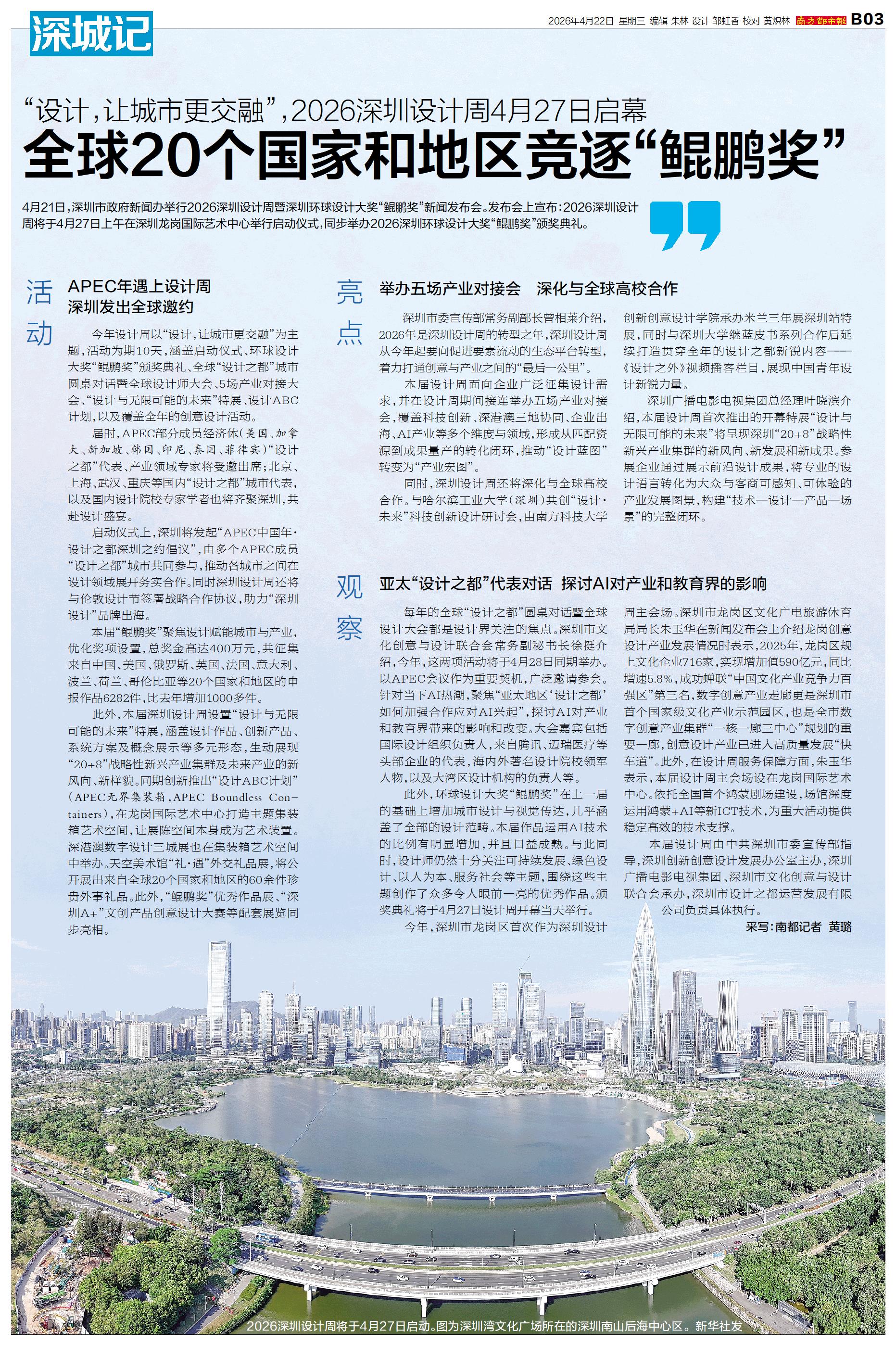 4月21日,深圳市政府新闻办举行2026深圳设计周暨深圳环球设计大奖“鲲鹏奖”新闻发布会。发布会上宣布:2026深圳设计周将于4月27日上午在深圳龙岗国际艺术中心举行启动仪式,同步举办2026深圳