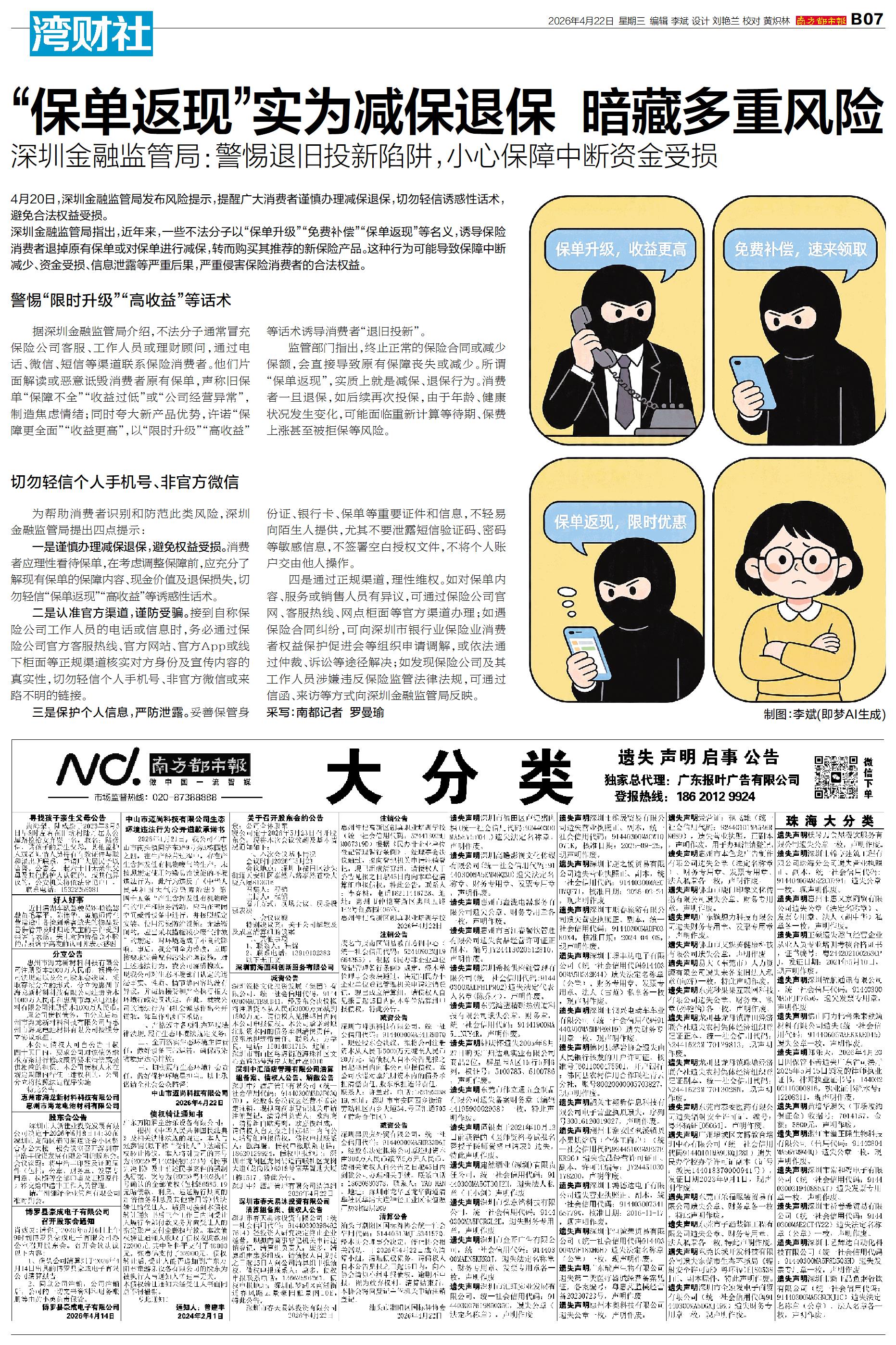 4月20日,深圳金融监管局发布风险提示,提醒广大消费者谨慎办理减保退保,切勿轻信诱惑性话术,避免合法权益受损。 深圳金融监管局指出,近年来,一些不法分子以“保单升级”“免费补偿”“保单返现”等名