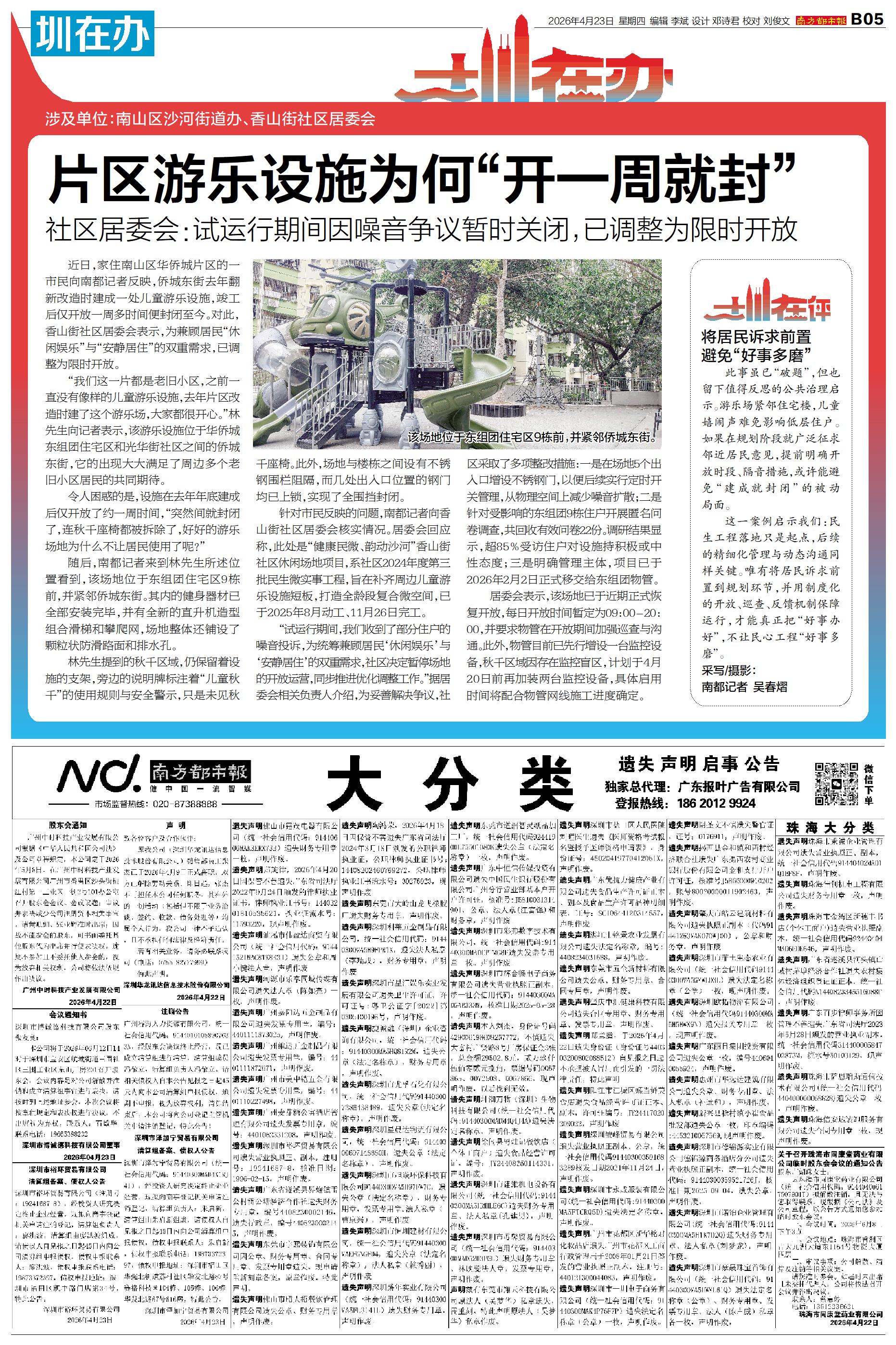 涉及单位:南山区沙河街道办、香山街社区居委会 近日,家住南山区华侨城片区的一市民向南都记者反映,侨城东街去年翻新改造时建成一处儿童游乐设施,竣工后仅开放一周多时间便封闭至今。对此,香山街社区居委