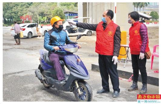 洪梅镇专设工作支援队,对出入人员进行体温检测。