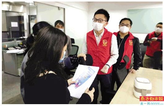 东莞税务干部在抗疫志愿服务工作中,为企业介绍战疫税费优惠政策。
