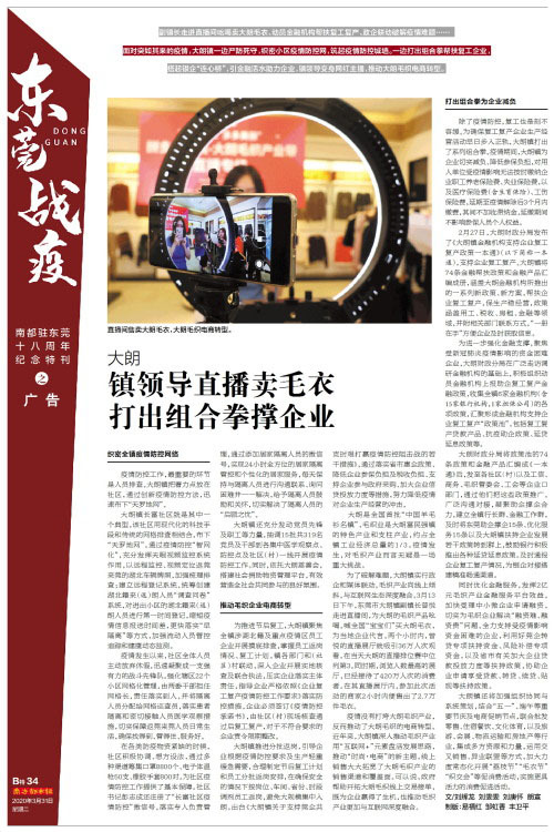 副镇长走进直播间吆喝卖大朗毛衣、动员金融机构帮扶复工复产、政企联动破解疫情难题…… 面对突如其来的疫情,大朗镇一边严防死守,织密小区疫情防控网,筑起疫情防控城墙。一边打出组合拳帮扶复工企业,