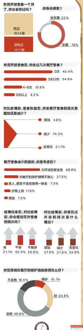 消费者信心问题,南都记者日前联合南都热点站站队开展了“东莞开放堂食一个月,您出去吃过吗”的调查也有所显示。本次话题有近2700名网友在线接受问卷调查,其中东莞居民占比78%。东莞开放堂食后,去过堂食的占比达59.6%,没有去过的占比40.4%。有74.3%的受访者表示减少频次的原因主要是考虑到大环境的安全性。