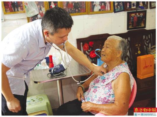 东莞寮步镇井巷社区卫生服务站的家庭医生廖锦鹏在长坑旧围四巷为老人看诊。 南都记者 刘媚 摄