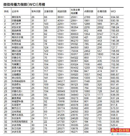 这次WCI指数榜单,“虎门太平”应该点赞,跃进三甲。从其10月的数据来看,在大家的发文总数都因为国庆长假锐减的同时,“虎门太平”却逆势增长。“寮步微视”虽然一直无法在WCI上冲顶,但其在看数一直稳居榜首,说明其在朋友圈非常活跃。