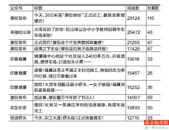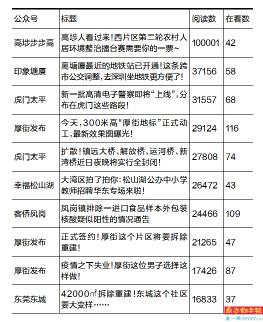 10月东莞镇街政务公众号原创榜单显示,“厚街发布”击败“印象塘厦”,重回榜首。记者从原创榜单了解到,“厚街发布”此次共有4篇原创文章上榜,其次是“印象塘厦”。值得一提的是,“厚街发布”排在榜首的文章《今天,300米高“厚街地标”正式动工,最新效果图曝光!》是上榜文章里面,唯一一篇在看数过百的文章,文章阅读量也将近三万,传播效果较好。而从文章题材来看,300米高的“厚街地标”动工,涉及城市面貌焕新,必然会引发读者关注。