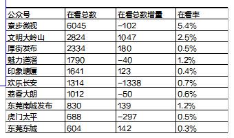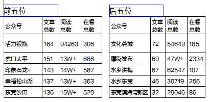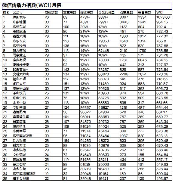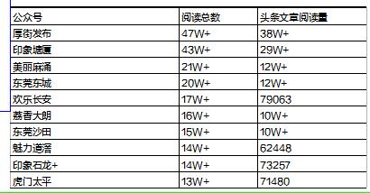 在这次WCI指数榜单中,跃进三甲的“东莞东城”应该被点赞。结合11月的其他数据来看,其文章总增量排在第三、阅读总数排在第四,头条文章阅读量也与“美丽麻涌”并列第三,说明“东莞东城”在本月有强劲发力。“寮步微视”虽然一直无法在WCI上冲顶,但其在看数一直稳居榜首,说明其在朋友圈的活跃度非常高。